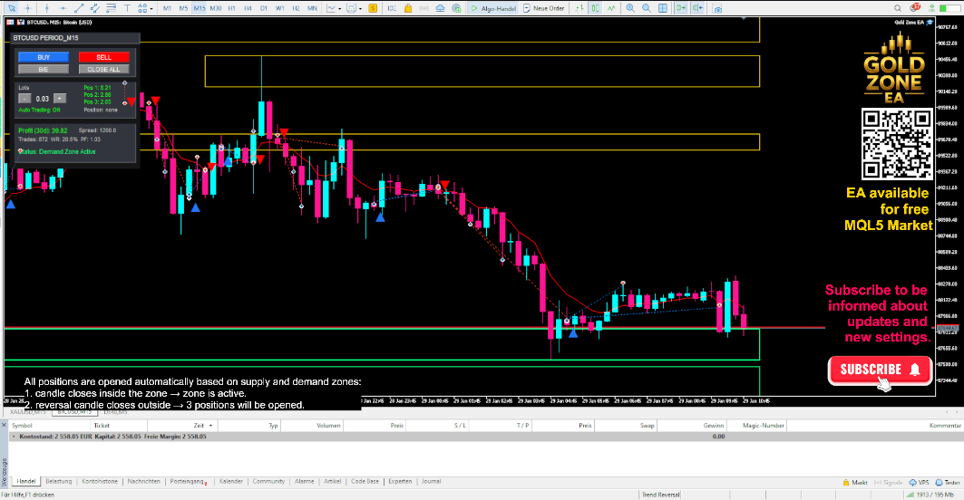 Gold Zone EA は、供給ゾーンと需要ゾーン(Supply & Demand)を用いて市場構造を分析し、あらかじめ定義された価格反応に基づいて自動的に取引を行う Expert Advisor です。 本EAは、ゾーン検出、モメンタム分析、EMA フィルター、複数のテイクプロフィット、ブレークイーブン、トレーリングストップ、さらにチャート上で操作可能な手動トレードパネルを統合しています。 対応銘柄の例: XAUUSD、EURUSD、GBPUSD、USDJPY、BTCUSD およびその他の多くの通貨ペア、指数、CFD に対応しています。 外部 DLL は不要です。 取引ロジック 供給・需要ゾーンの検出 EA は以下を用いて構造的な価格領域を識別します: ベースキャンドル(Base High / Base Low) キャンドルパターンフィルター オプションの EMA トレンド強度 ゾーンサイズと重複チェック 無効化されたゾーンの自動除去 価格が複数回ゾーンを突破する、または無効化カウンターに達するとゾーンは非アクティブになります。 ゾーンのアクティベーション
