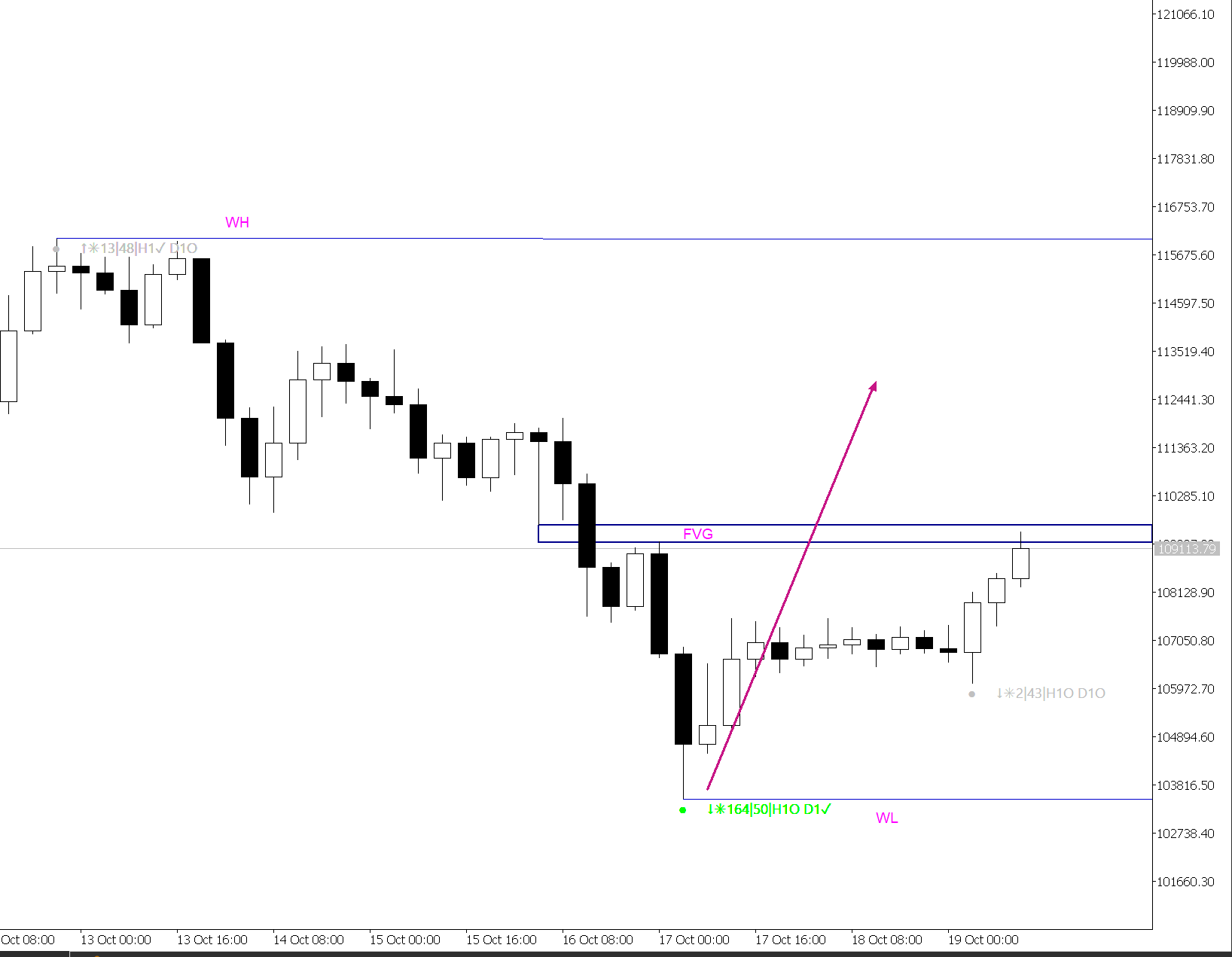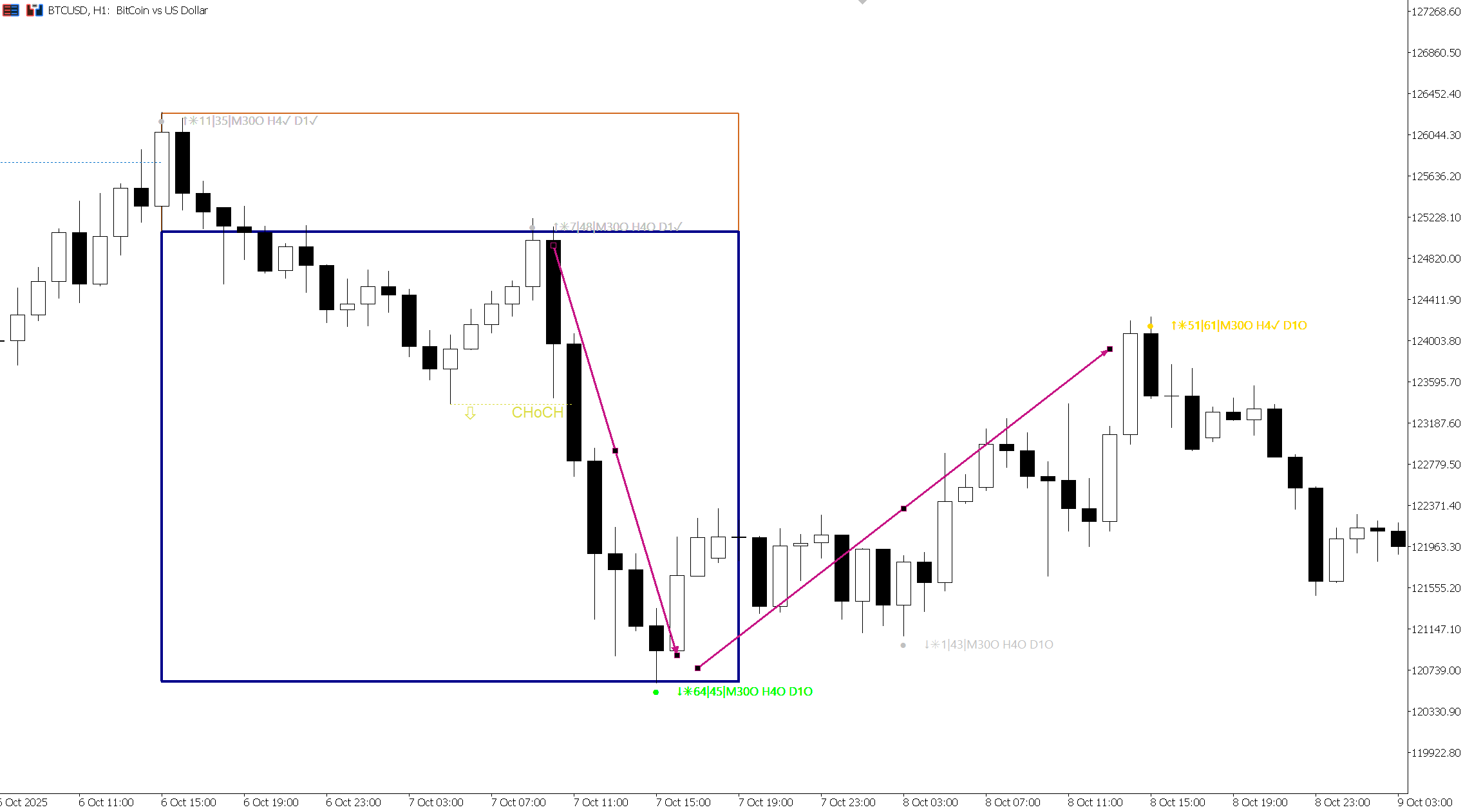Today I was clearly able to take buy trades as the indicator clearly showed a strong green signal of high quality (Qty) indicating that the price would rise. If it doesn't generate a reaction in the FVG, it will go down towards last week's high-value pair. This is BTCUSD.