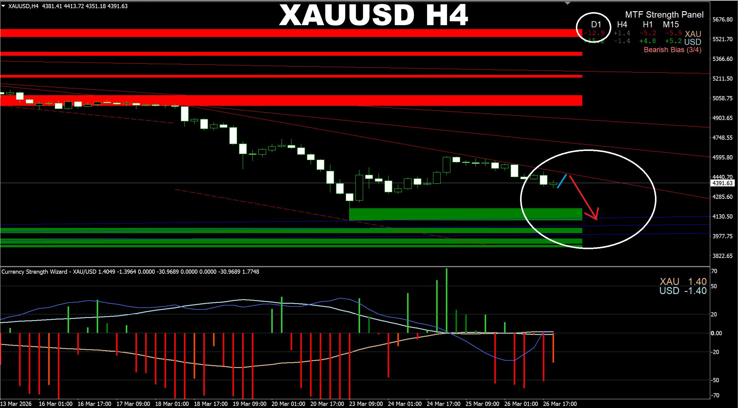 Currency Strength Wizard. XAUUSD H4. Update on my previous post. As I said in the previous post, I think the price will go lower soon. And here the CSW indicator helps me with the market analysis work. First of all the indicator shows the D1 is definitely on the SELL side of the market. Another thing we need to pay attention to is the position of the main strength lines on H4. We see they show slight UP strength. But at the same time the swing predictor line is above the 0 level. It means that the SELL swing move is being prepared in the market. As a result this is how we can predict the next moves. First we may see a pullback UP, not a big pullback though. And then the price reverses down and test current Support area, the green area and the first blue up trend line on this chart.