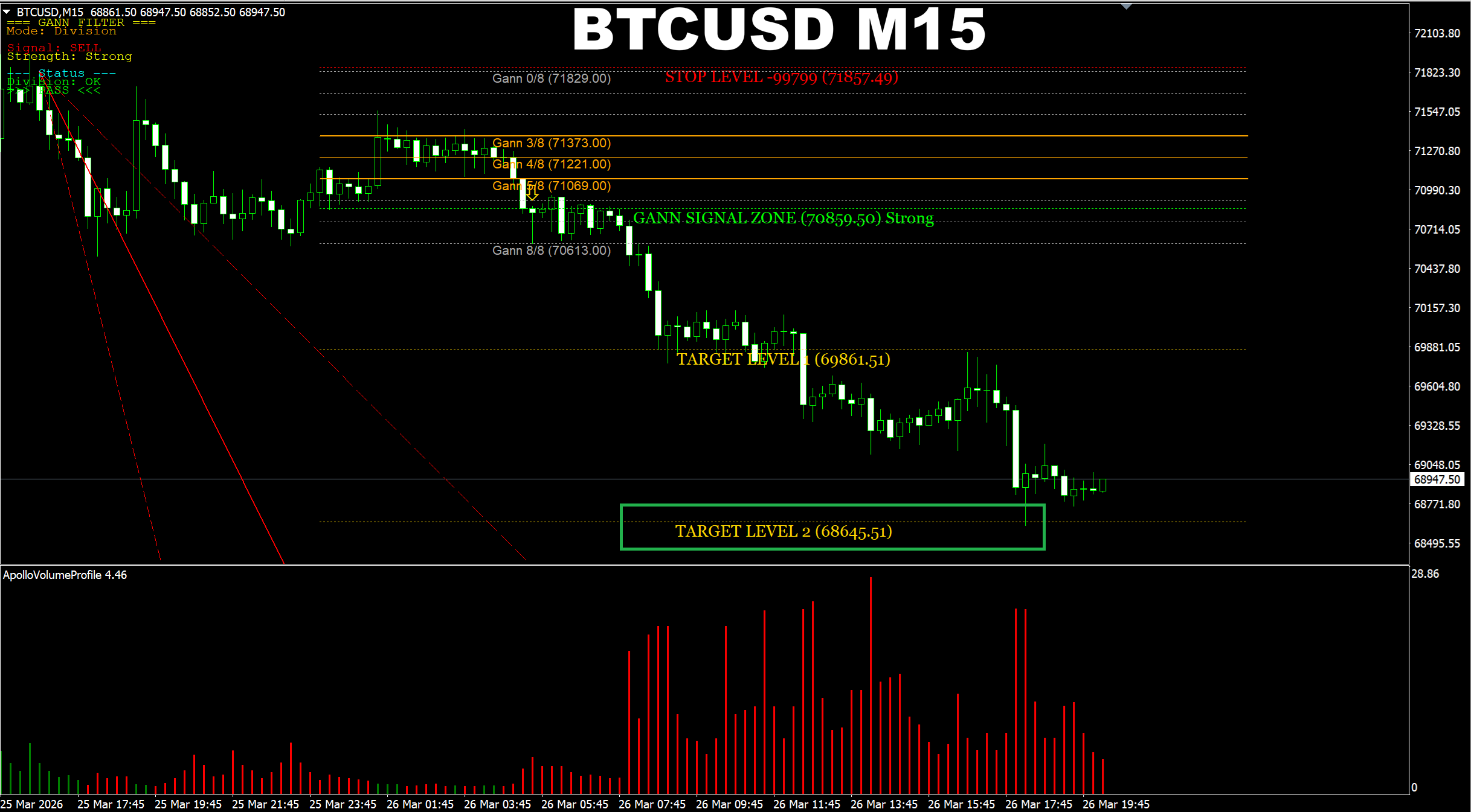 Gann Made Easy. BTCUSD M15. Price has reached the earlier predicted target. Now as it was suggested earlier, it is better to wait for further price action as the price is being traded now at Support area. Even if the price goes down again, first we will probably see a pullback up to the 69300 area. And when the pullback is over, we will probably see the price to continue going down again. Based on the next higher time frames' signals anaysis, next possible sell move will be down the 67900 area. But as for now we need to wait for a pullback to be completed. By the way, if we check H1, we will see the price is being traded near the Gann 8/8 area. It it means if the price goes lower to the area I suggested earlier, the chance is high it will go even lower as in this case the price will be traded in the selling gann zone area based on the H1 time frame.