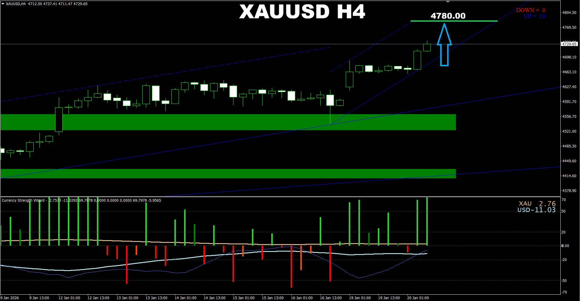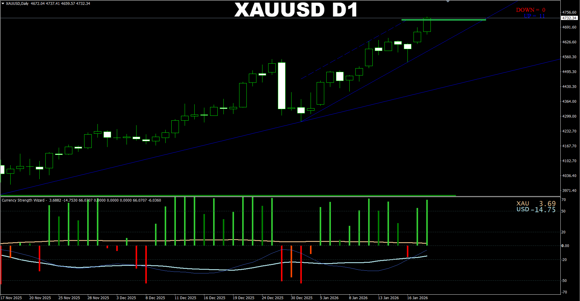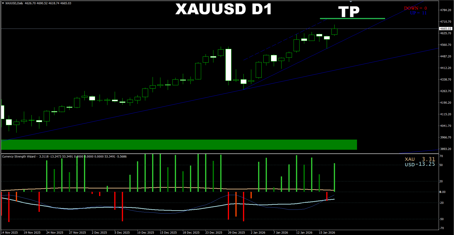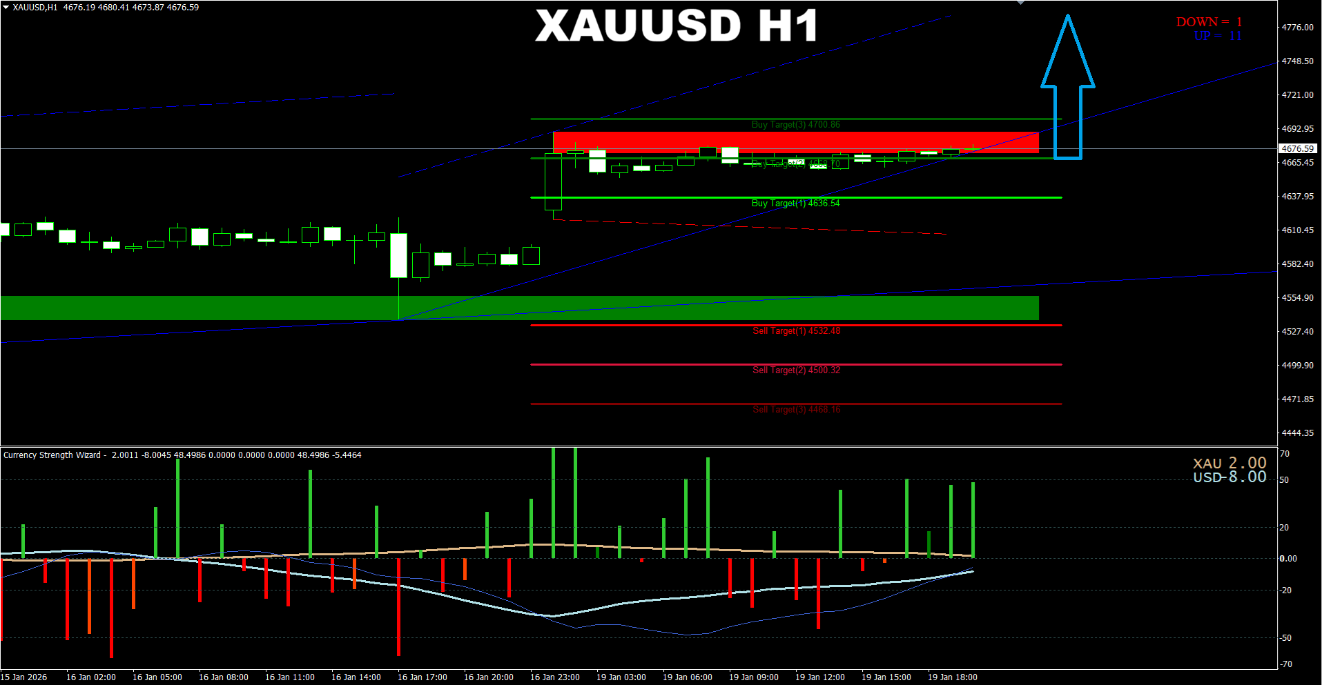 Currency Strength Wizard. XAUUSD D1. Update on current market. Price is heading to the earlier predicted area.