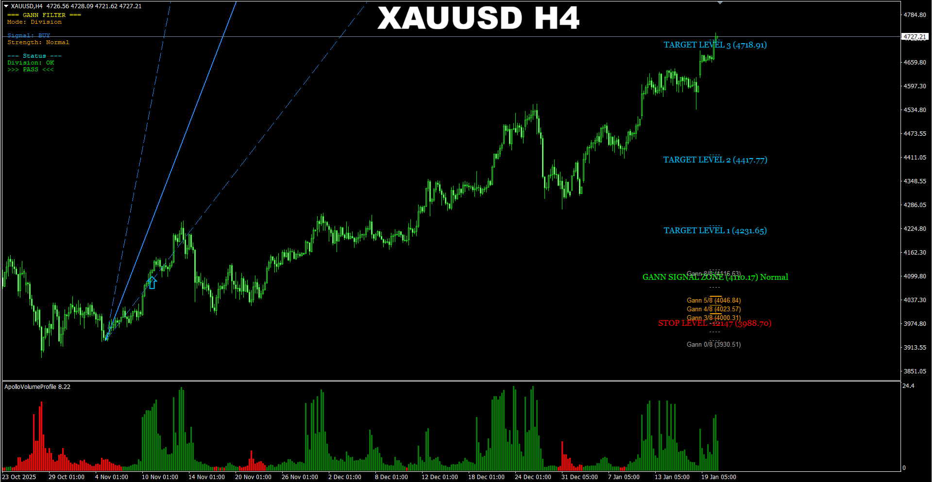 Gann Made Easy. XAUUSD H4. Update on current signal progress. Price is approaching the 3rd target area.