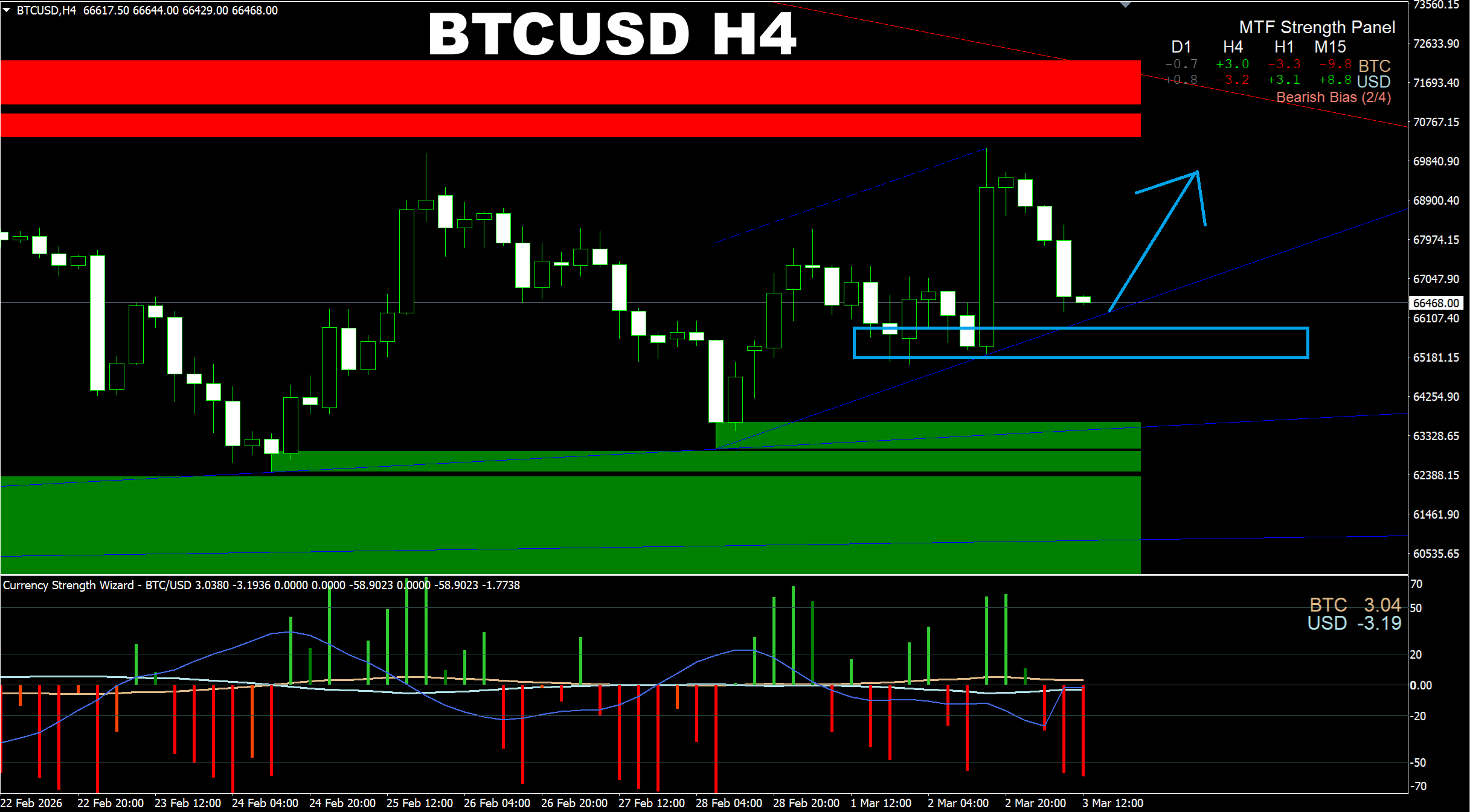 Currency Strength Wizard. BTCUSD H4. Despite the intraday bearish bias, the BTCUSD has tendency to rise. We will probably see a new UP wave soon from the bottom of the channel which, as a result, will lead the price UP to the current Resistance area with a chance of breakout. Then the price may continue going UP to the target I suggested yesterday based on the D1 chart analysis.