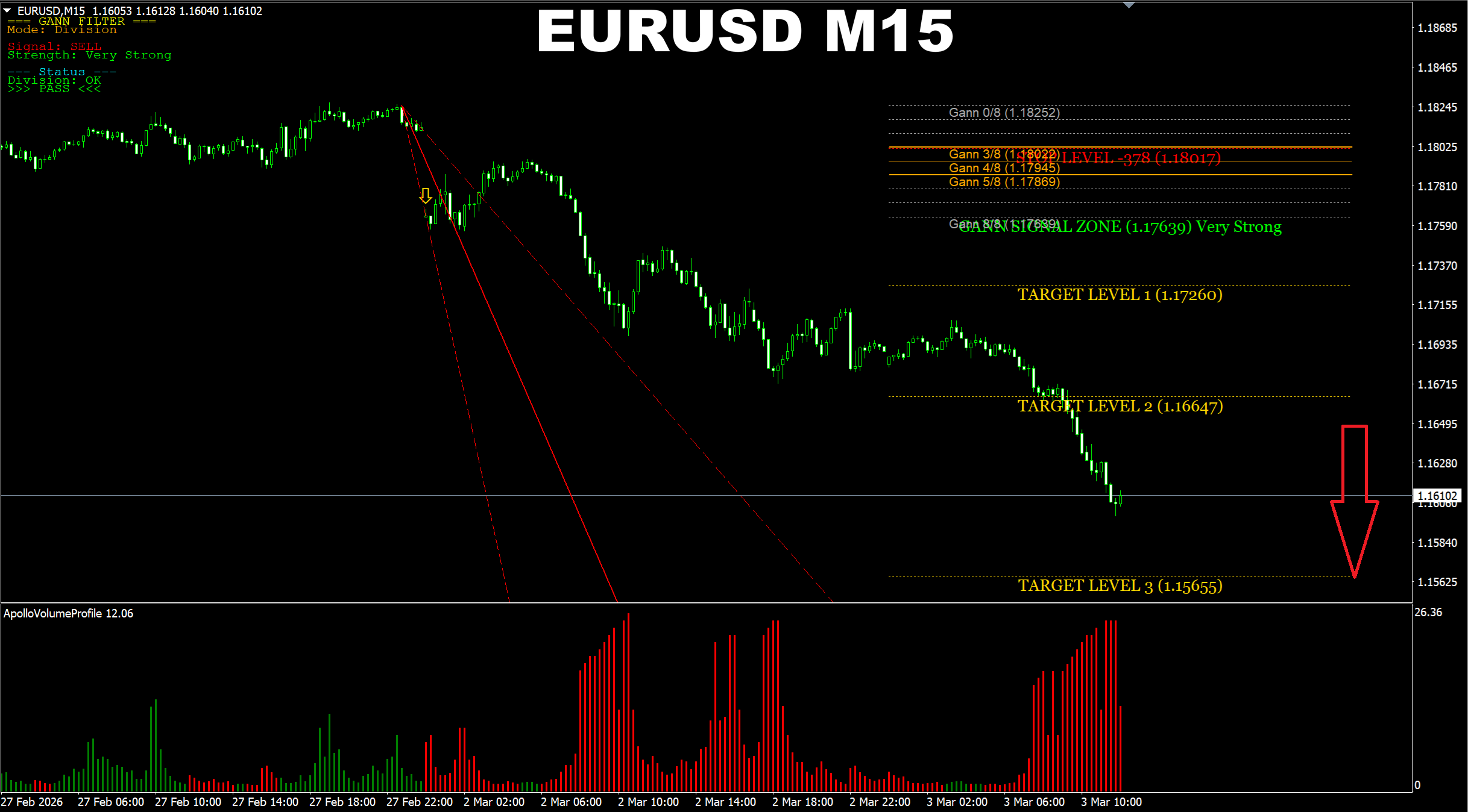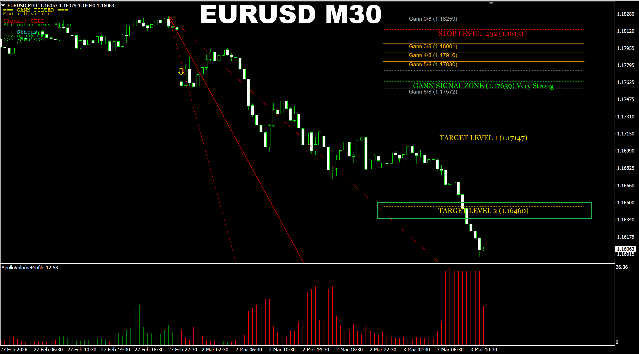Gann Made Easy. EURUSD M30. Update on the yesterday's SELL prediction. Price has reached the earlier predicted target.