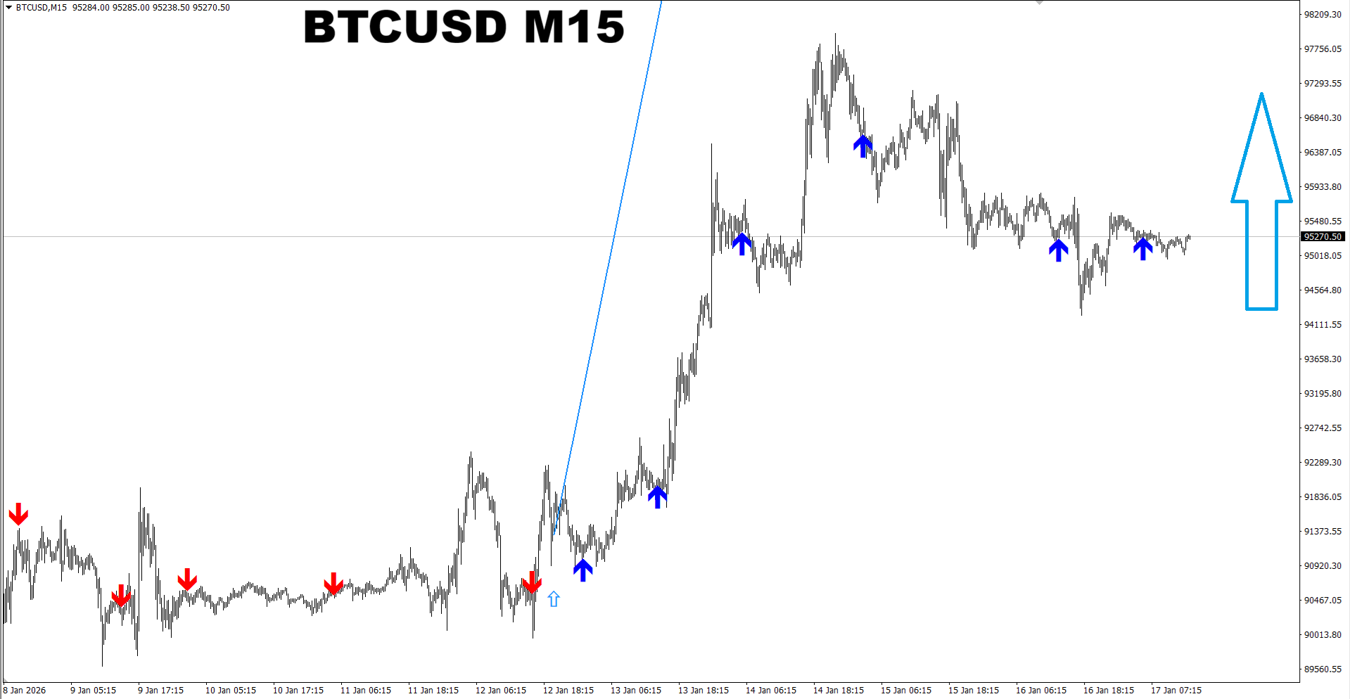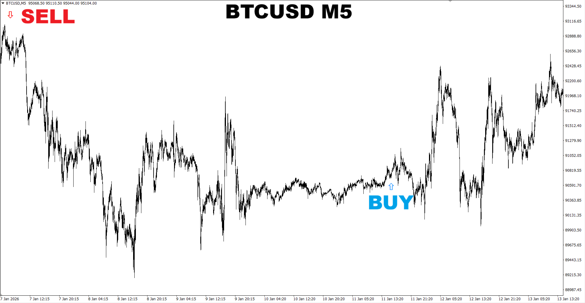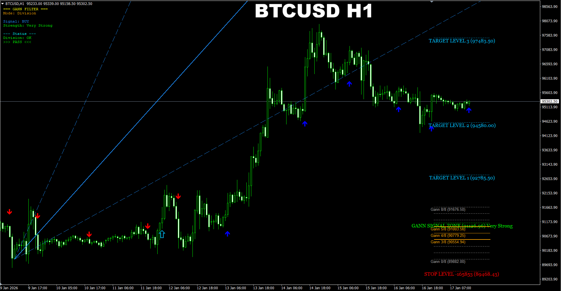 Gann Made Easy. BTCUSD M5. Update on current market. The indicator suggested changing the direction to SELL and provided a new SELL signal telling current SELL signal is very strong compared to the strength of previous BUY signal which was the Normal one. So it seems the chance for a short-term SELL move is higher now.