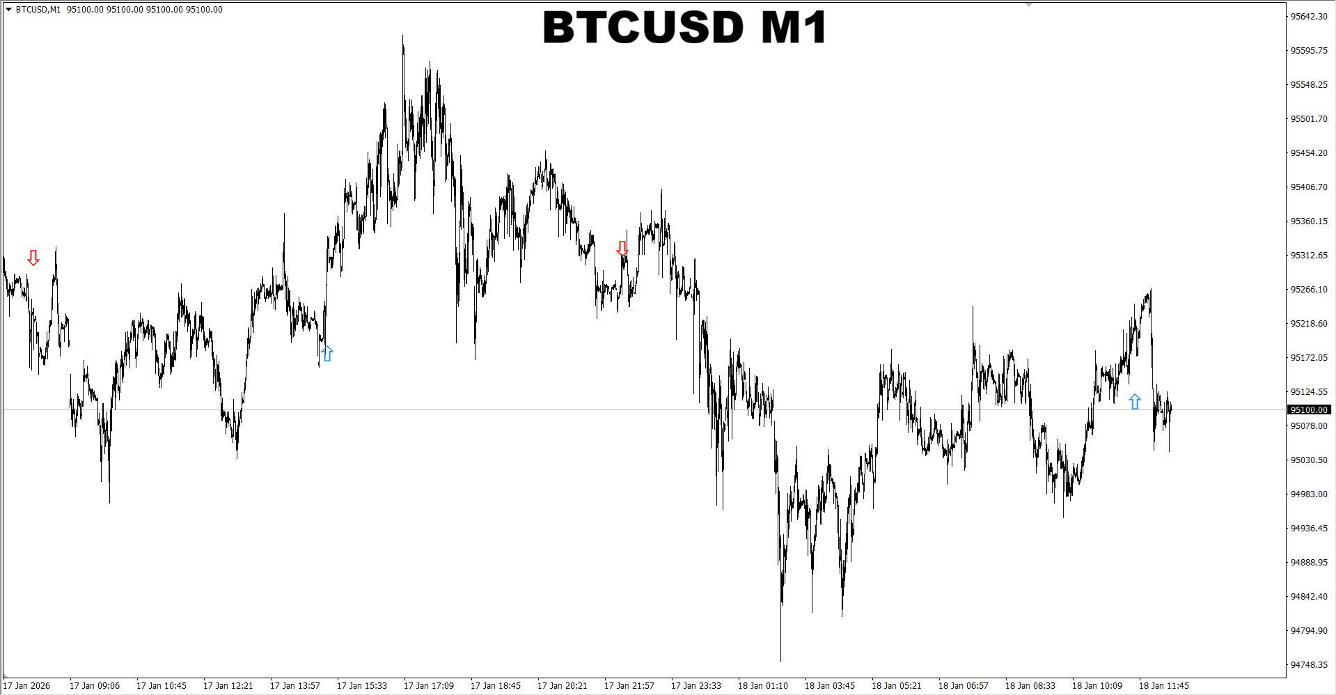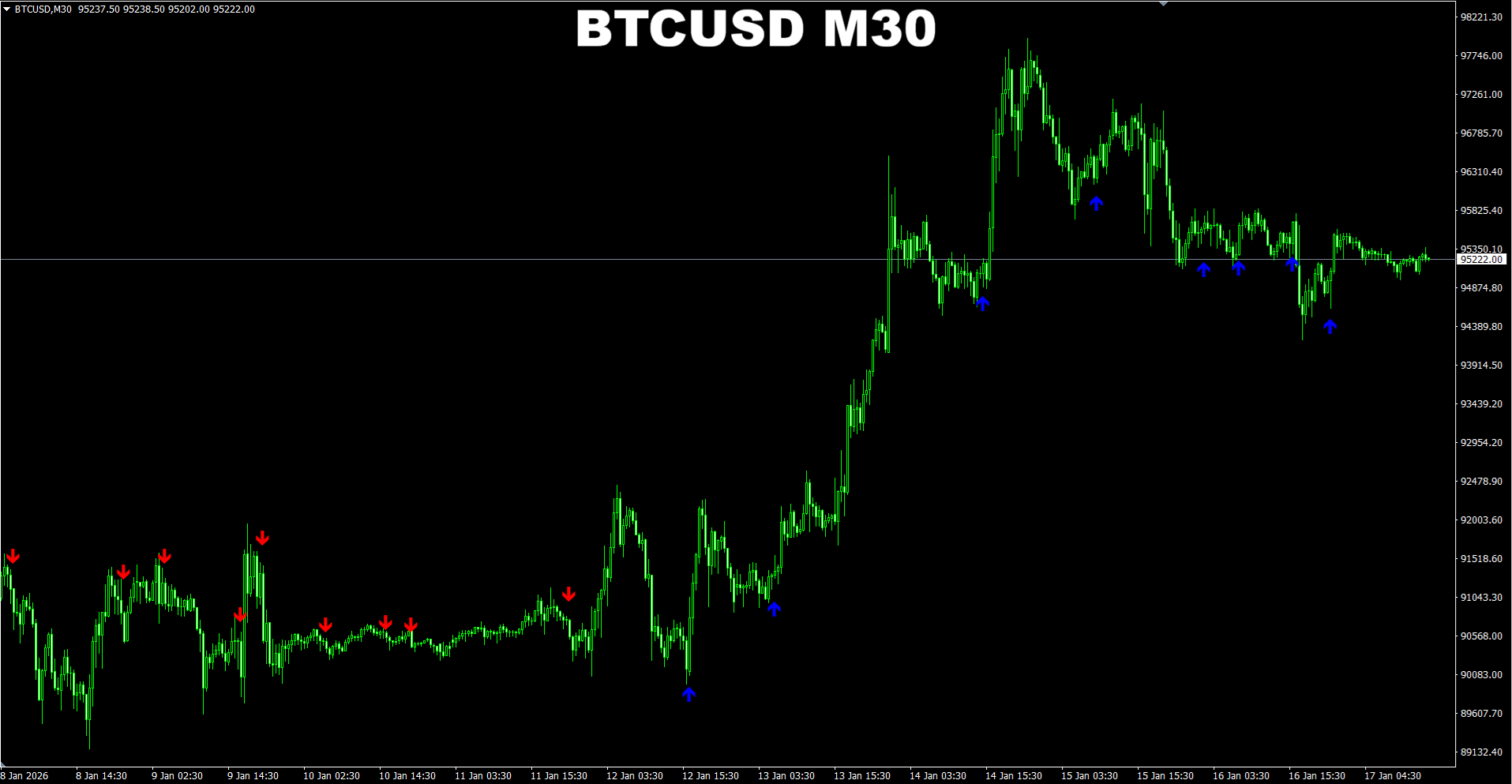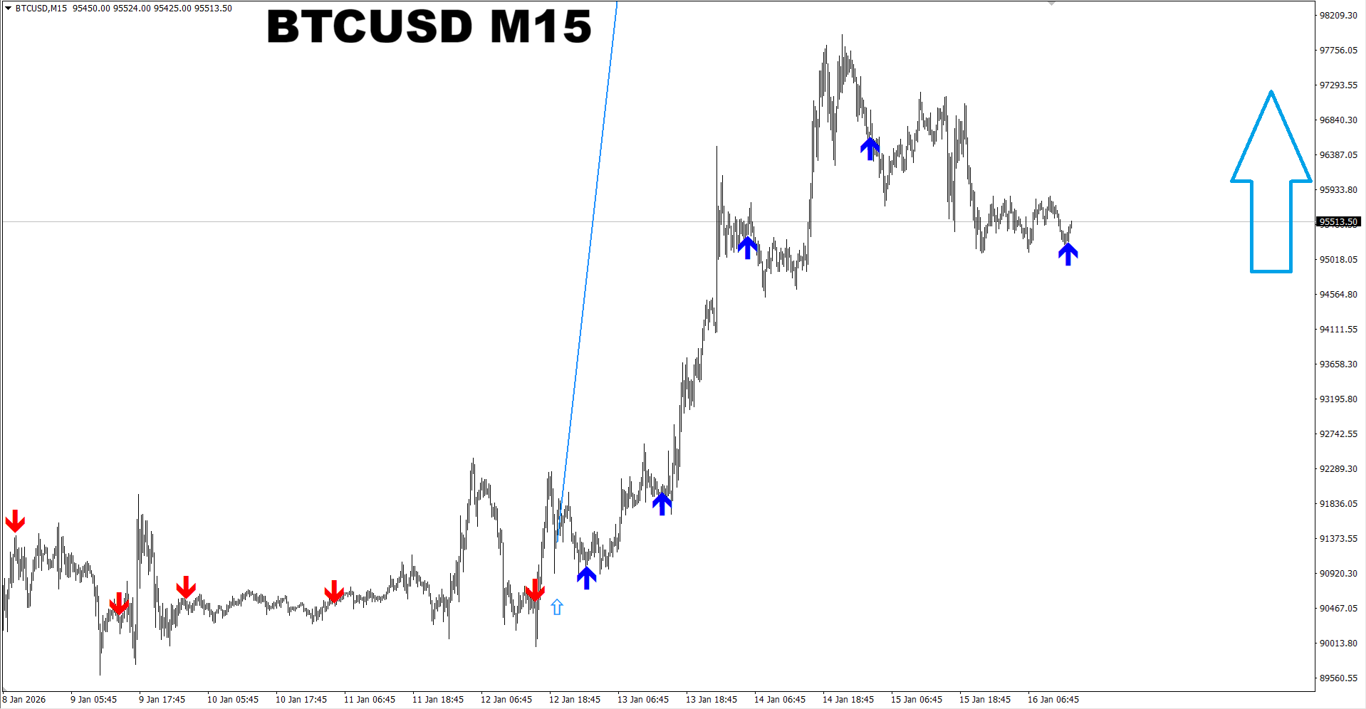 Gann Made Easy. BTCUSD M5. Update on current market. The indicator suggested changing the direction to SELL and provided a new SELL signal telling current SELL signal is very strong compared to the strength of previous BUY signal which was the Normal one. So it seems the chance for a short-term SELL move is higher now.
