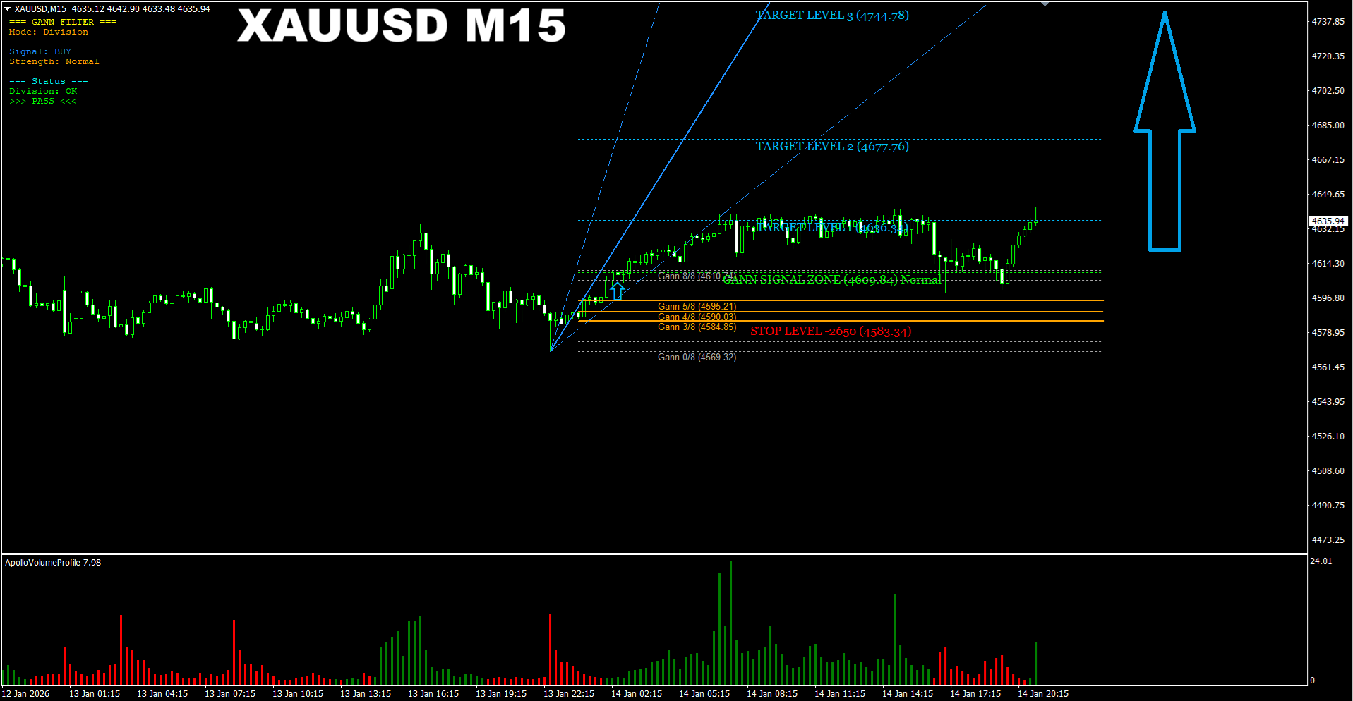 Gann Made Easy. XAUUSD M15. Update on the progress of the current BUY signal. Price has just recently got more BUY volume from the golden Gann key levels area and now it has more strength to go in the predicted direction.