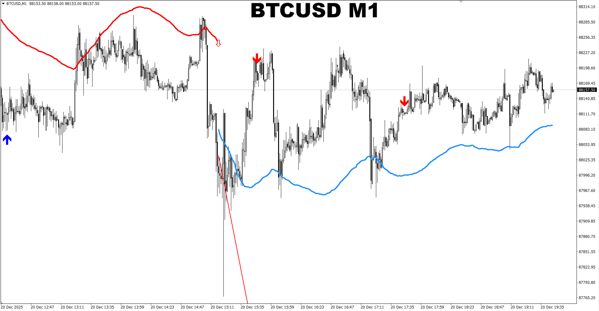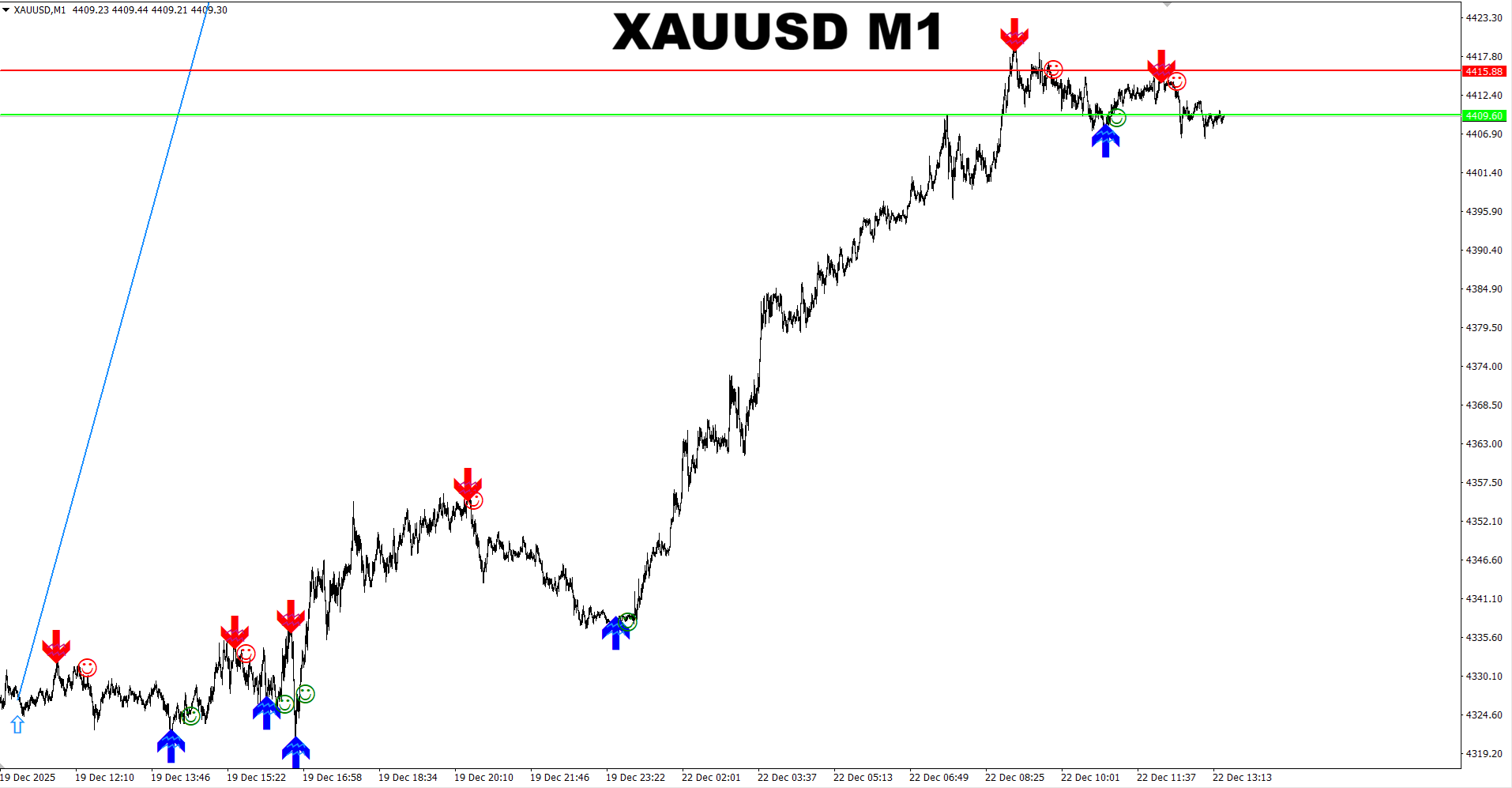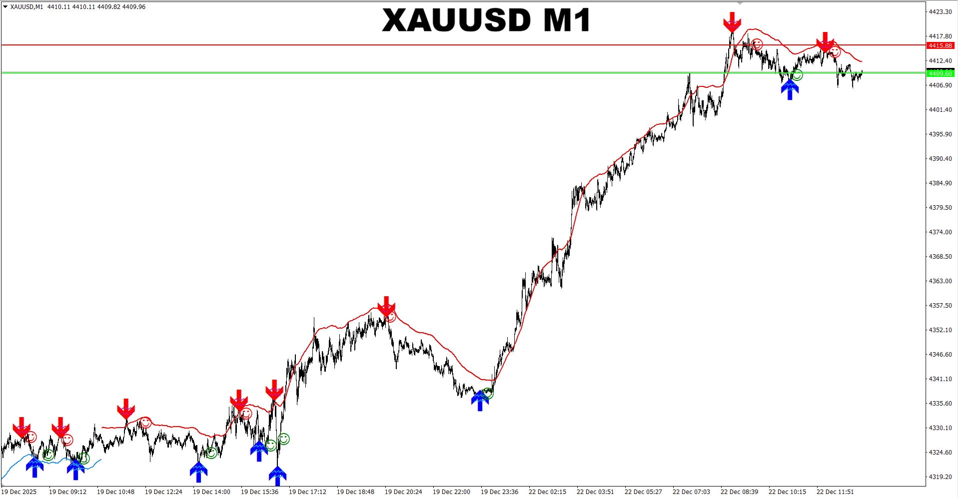Apollo SR Master + Dynamic SR. XAUUSD M1. Recent signals performance. Dynamic SR is RED - we take only BUY signals. Dynamic SR is BLUE - we take only SELL signals.