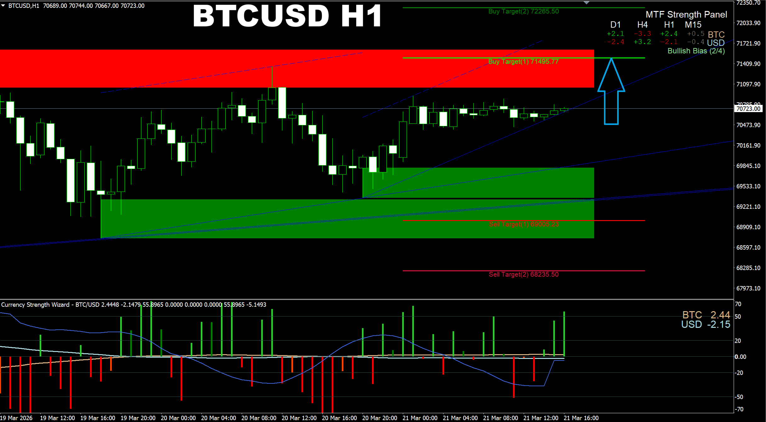 Currency Strength Wizard. BTCUSD H1. Update on current market. Previous Gann M15 SELL signal almost hit the SL as the price was very close to the SL area. If you're keeping the SELL postion, I believe it is better to close it now as there is a chance of a possible UP impulse to the 71495 area. Moreover D1 TF is still showing bullish bias. In current conditions I would better wait a bit for the further price reaction.