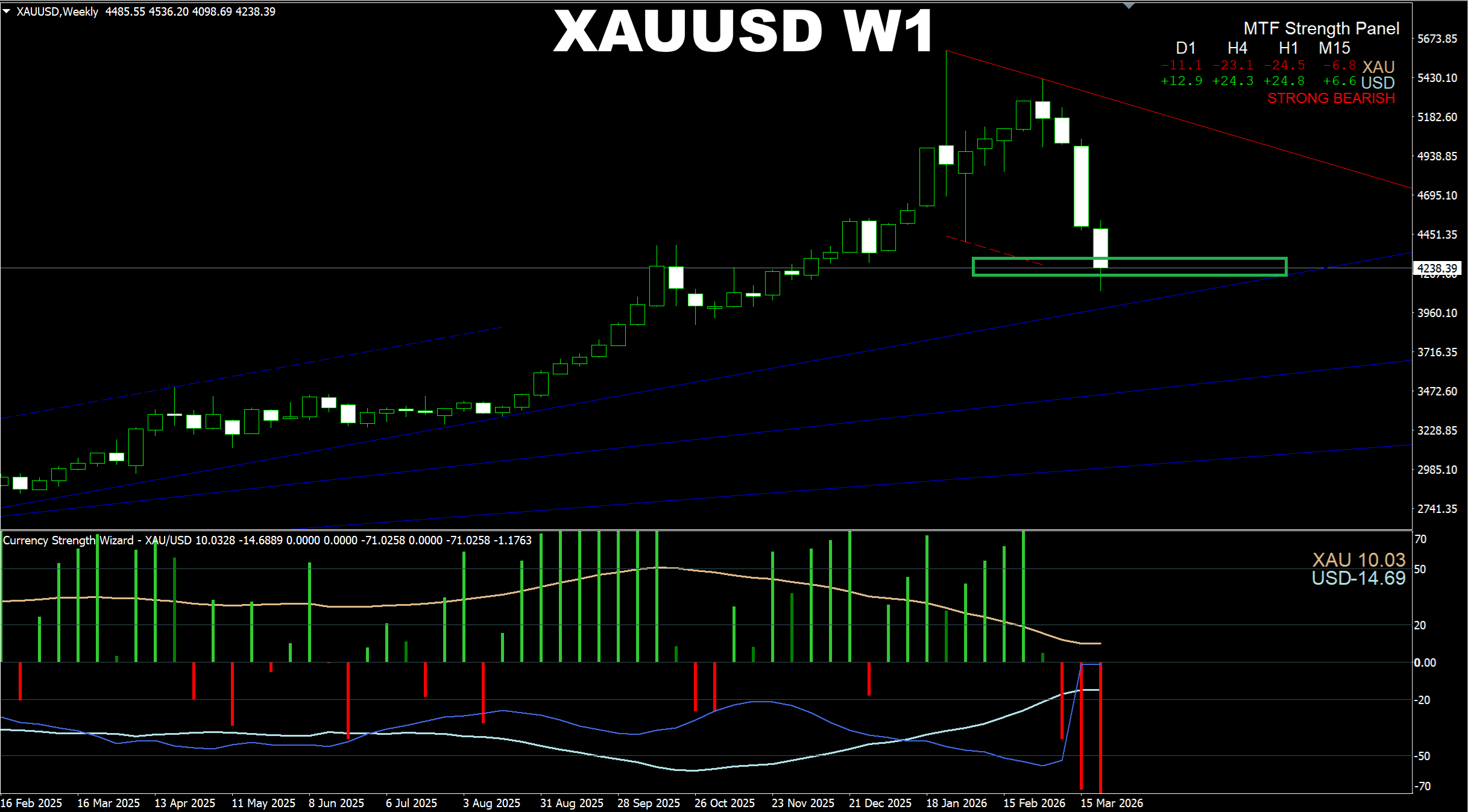 Currency Strength Wizard. XAUUSD W1. Outlook for the next few days. SELL pressure is expected again. Before the price reverses and goes UP, the price will reach at least the 4300 area with a chance of going lower. Anyways as for now we should concentrate more on selling XAUUSD, at least till the moment when we start getting the signs of possible change of trend direction.