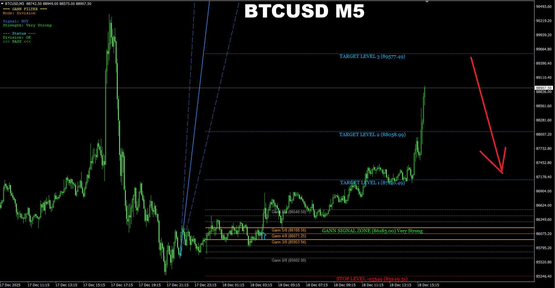 Gann Made Easy. BTCUSD M15. Current market. Now price is going up but I do not recommend buying at current moment because the chance is high the price will reverse down from the TP1 area.