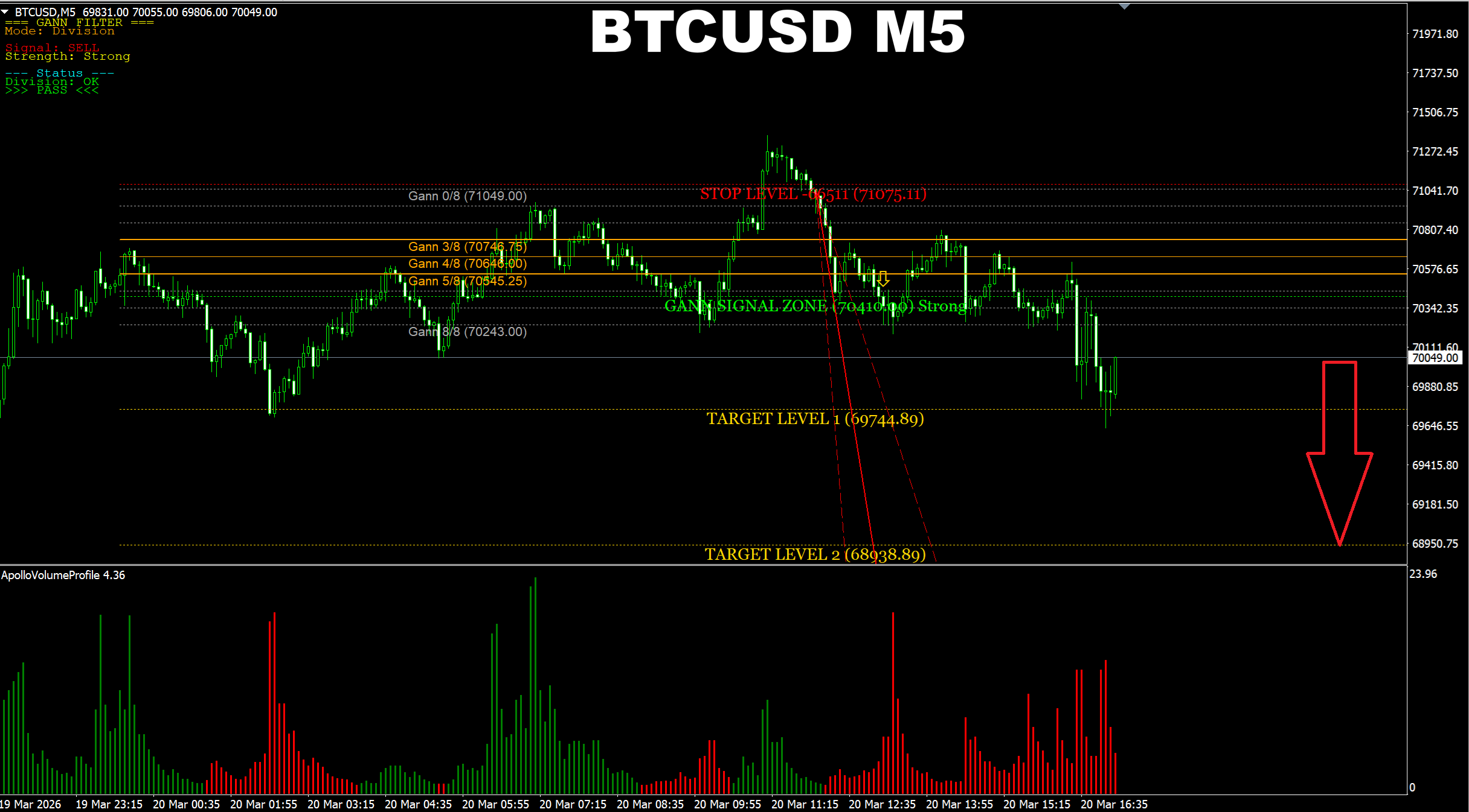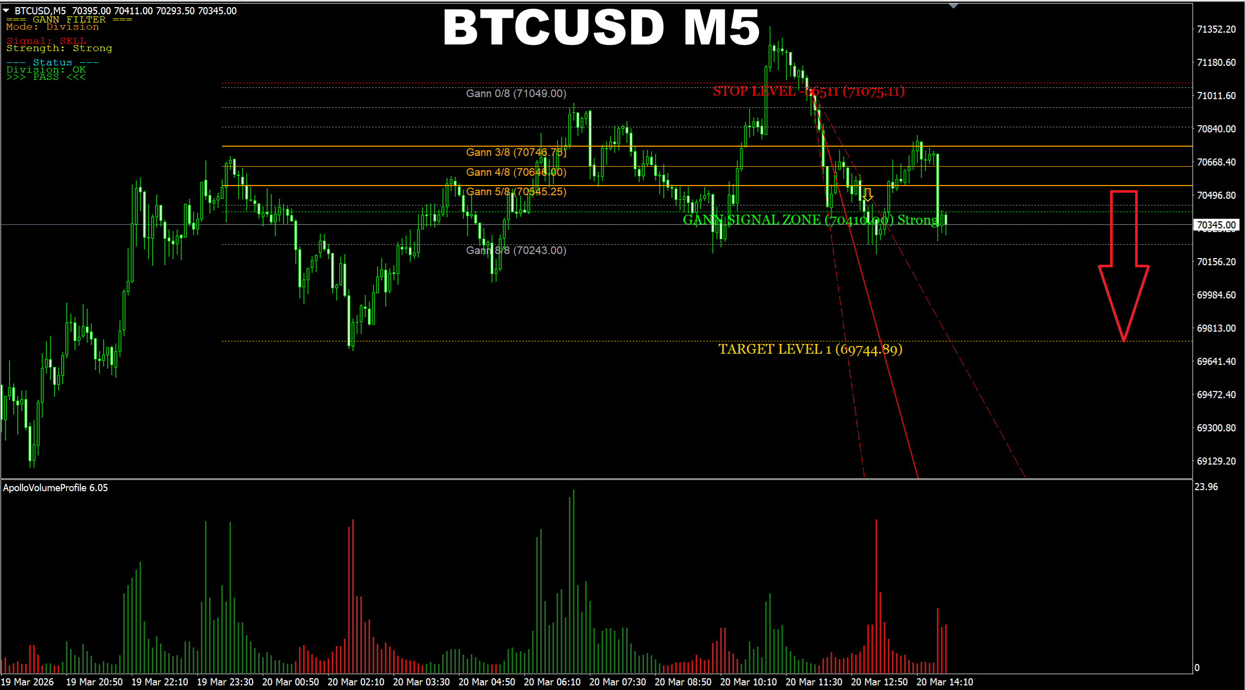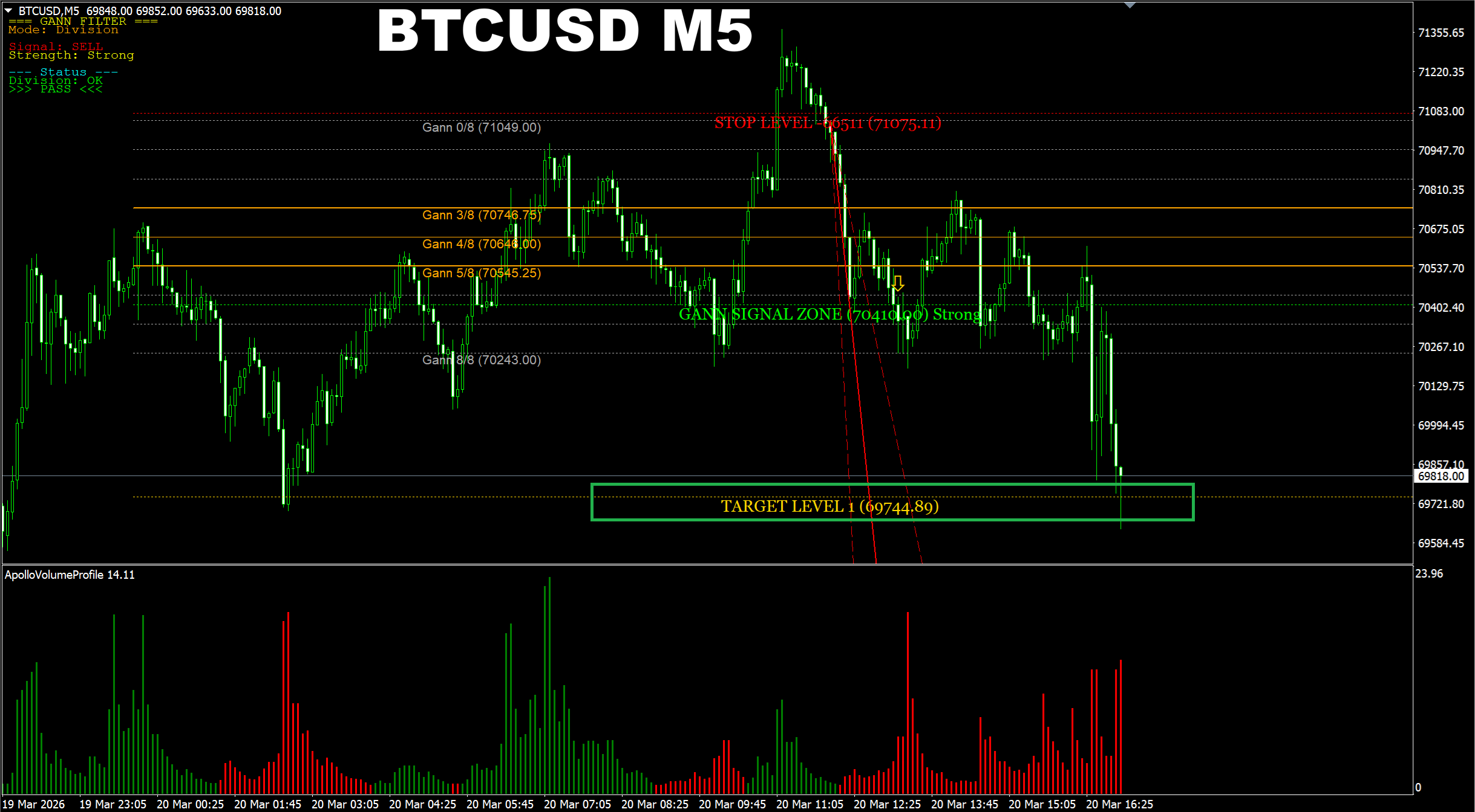 Gann Made Easy. BTCUSD M5. Current market. And here we have a confirmation and an active signal UP which has already reached the main target. So as it was suggested earlier, the price will go up to the 71.5K area.