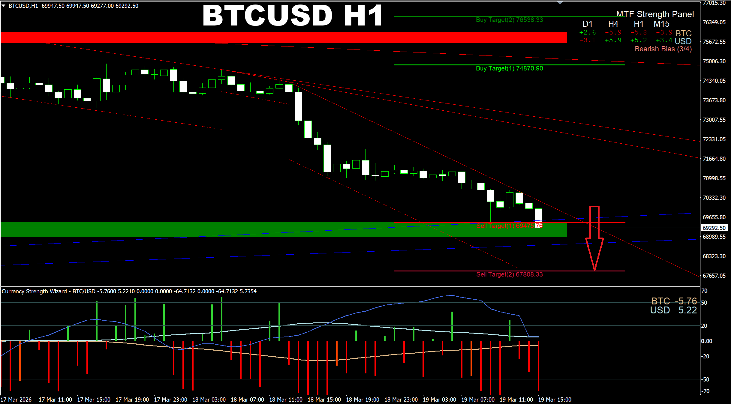 Currency Strength Wizard. BTCUSD H1. Update on current market. Previous Gann M15 SELL signal almost hit the SL as the price was very close to the SL area. If you're keeping the SELL postion, I believe it is better to close it now as there is a chance of a possible UP impulse to the 71495 area. Moreover D1 TF is still showing bullish bias. In current conditions I would better wait a bit for the further price reaction.