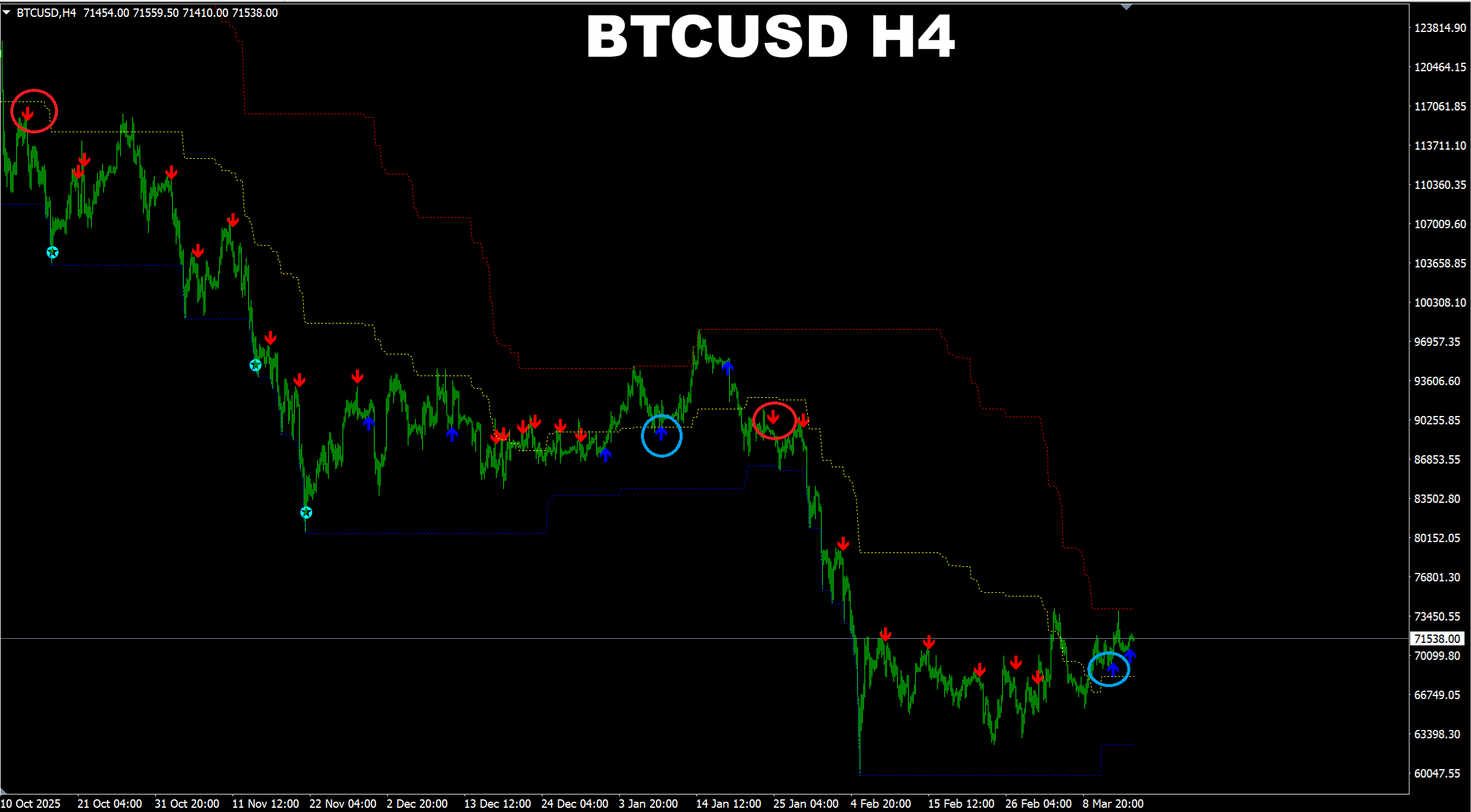 Pips Generator. BTCUSD H4. Default settings. Current market. Recent trend reversal signals based on the simple rules of the strategy.