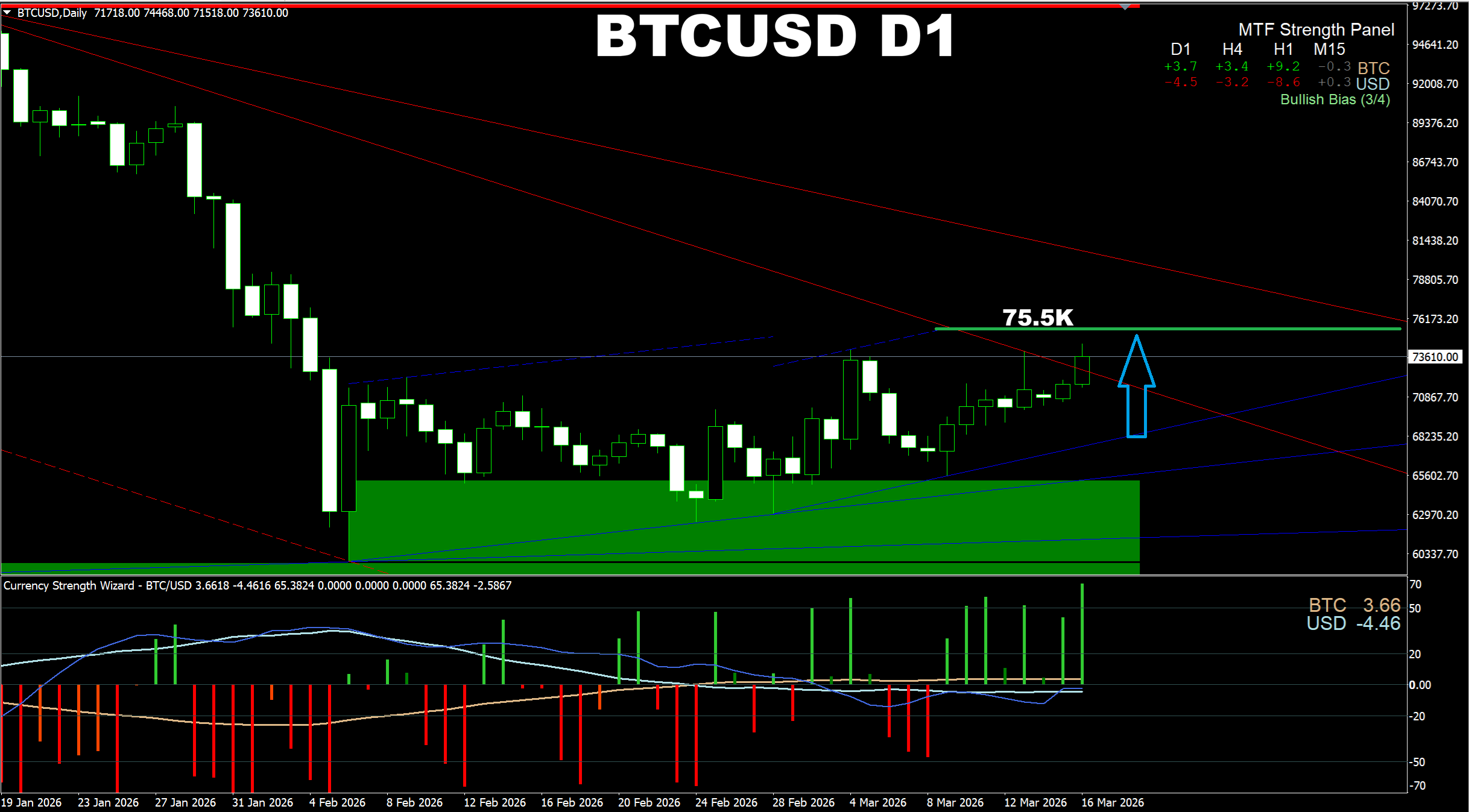 Currency Strength Wizard. BTCUSD D1. Update on recent target prediction. Price has reached the earlier predicted target of 75.5K.