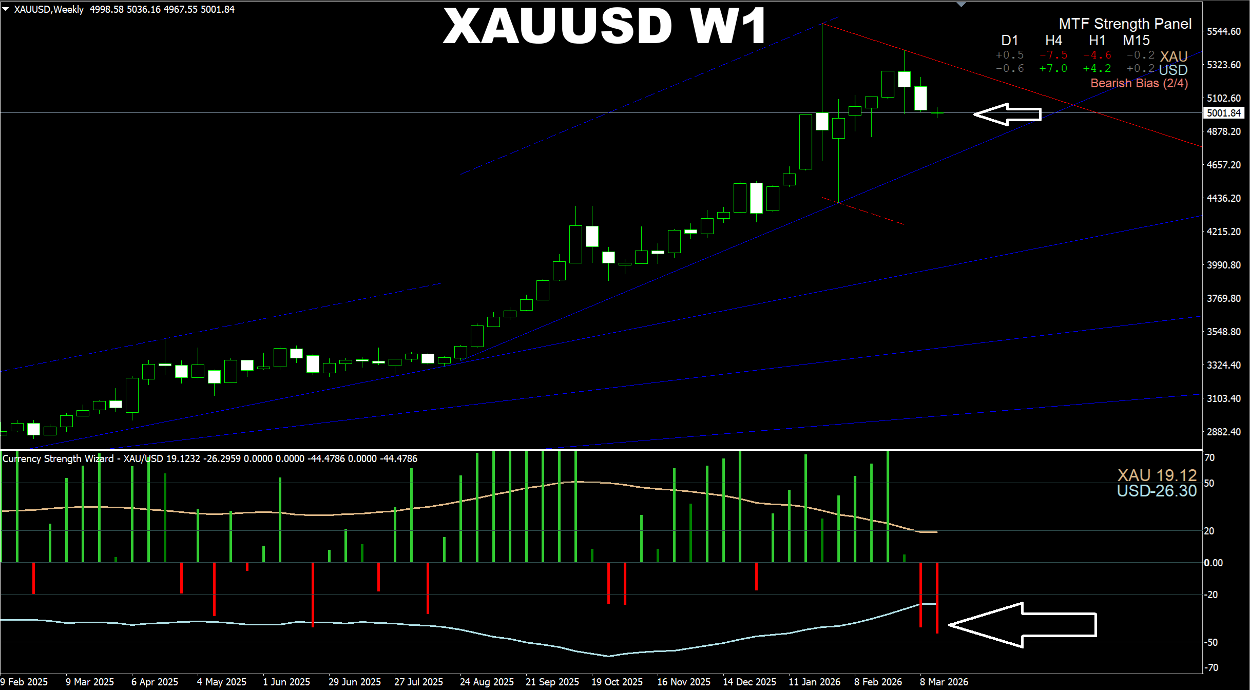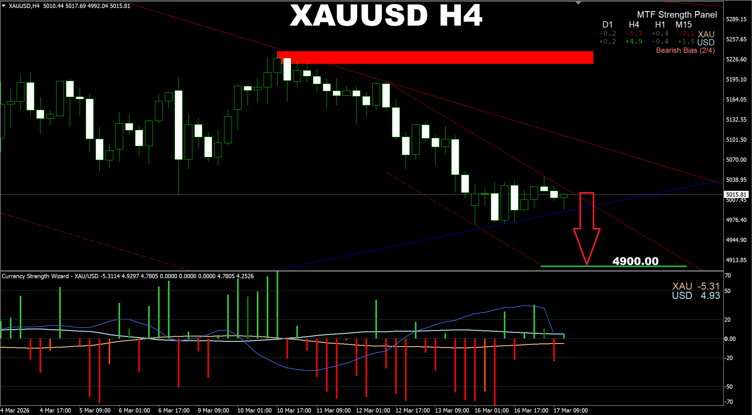Currency Strength Wizard. XAUUSD H4. Current market. Both the main strength algo and the swing predictor algo show the possibility of a breakout and a new SELL wave down to the 4900.00 area. Though I assume that there is also a chance for a price to go a bit UP first before it goes to the predicted area. We also need to take this into consideration. As a result for a safe entry it is possible first to wait for a reaction of the market and if the SELL strengh increases (or if we see the price starts going to the recent low, we may enter the market in this case.
