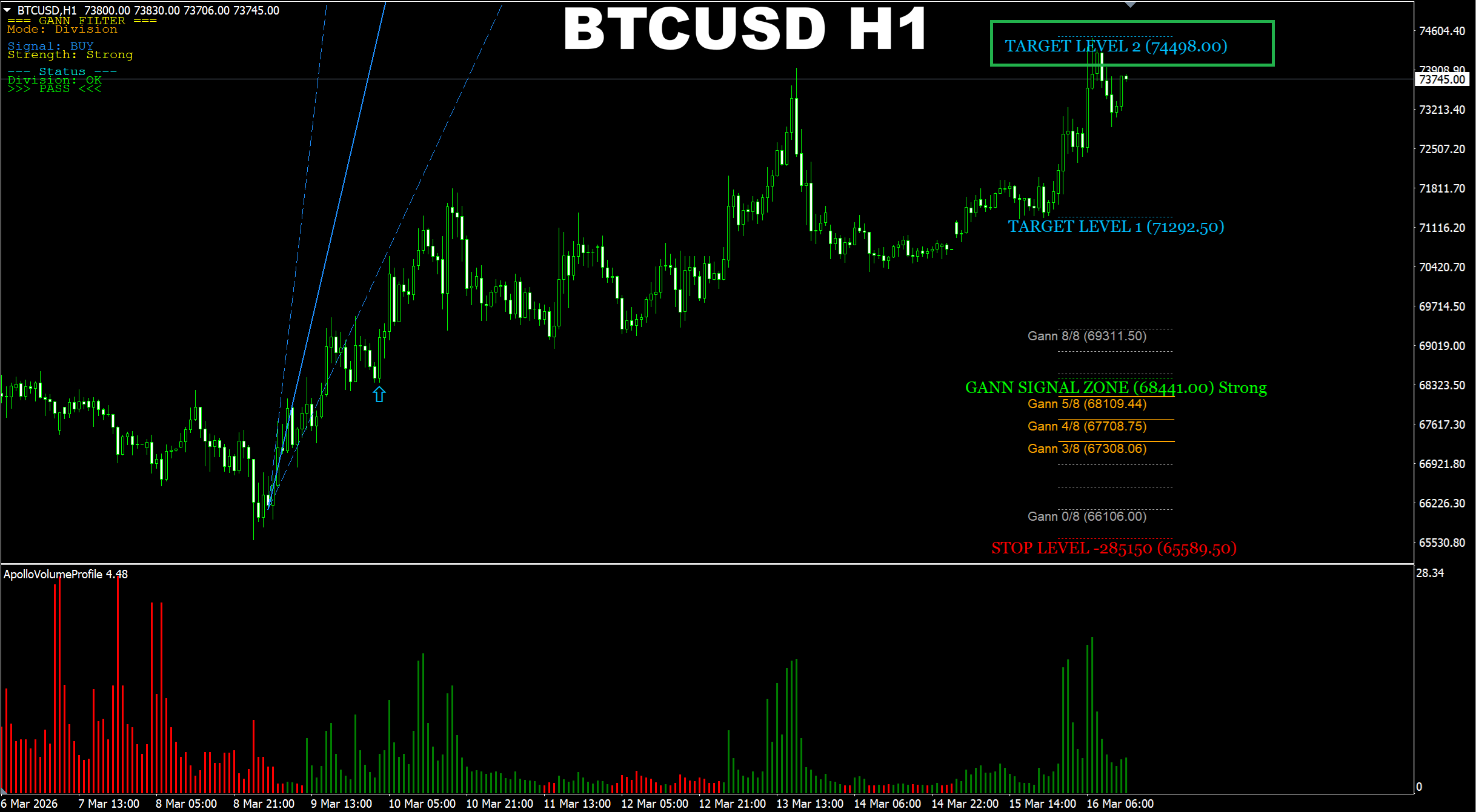 Gann Made Easy. BTCUSD H1. Update on current BUY signal. Volume has been increasing recently and this is a good sign for possible BUY in the direction of the Target Level 2.