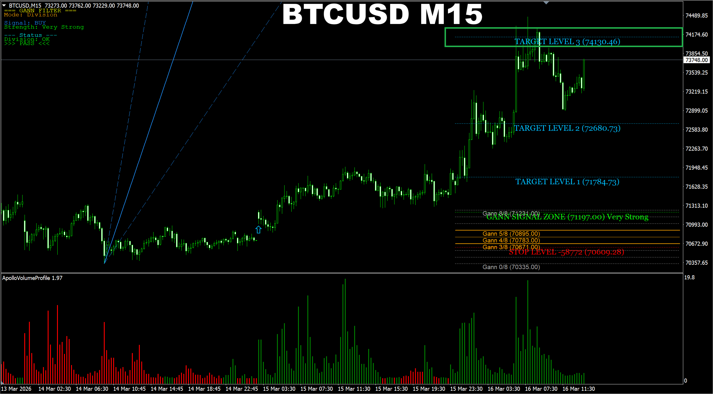 Gann Made Easy. BTCUSD M15. Update on current market. We have a very strong type BUY signal here which has already reached the main target. But the price has a good chance to reach the TP3 area. And thus we can use this signal. Though please note that there is a chance for a pullback to the Gann signal area as the current TP1 may push the price a bit lower before it continues going UP. On the other hand if the price stays for some time at current area we will see a new Support born which will push the price UP without any pullback. So both options are possible. But anyways the overall trend is UP now so the UP signal is valid and active. And one more thing, based on current market conditions the Gann 0/8 area will be a better SL option than the SL generated by the indicator at the moment of the signal.