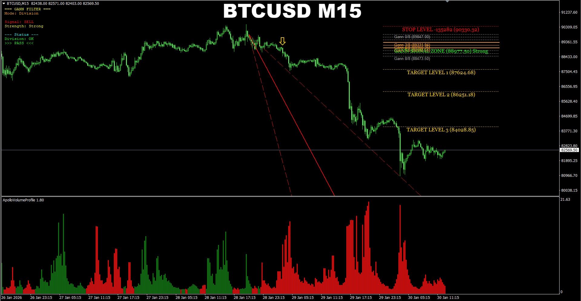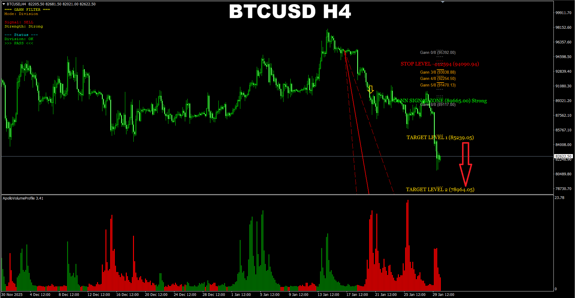 Gann Made Easy. BTCUSD H4. Update on the next target. There might be a pullback but the price should go lower eventually and reach the 2nd TP area.