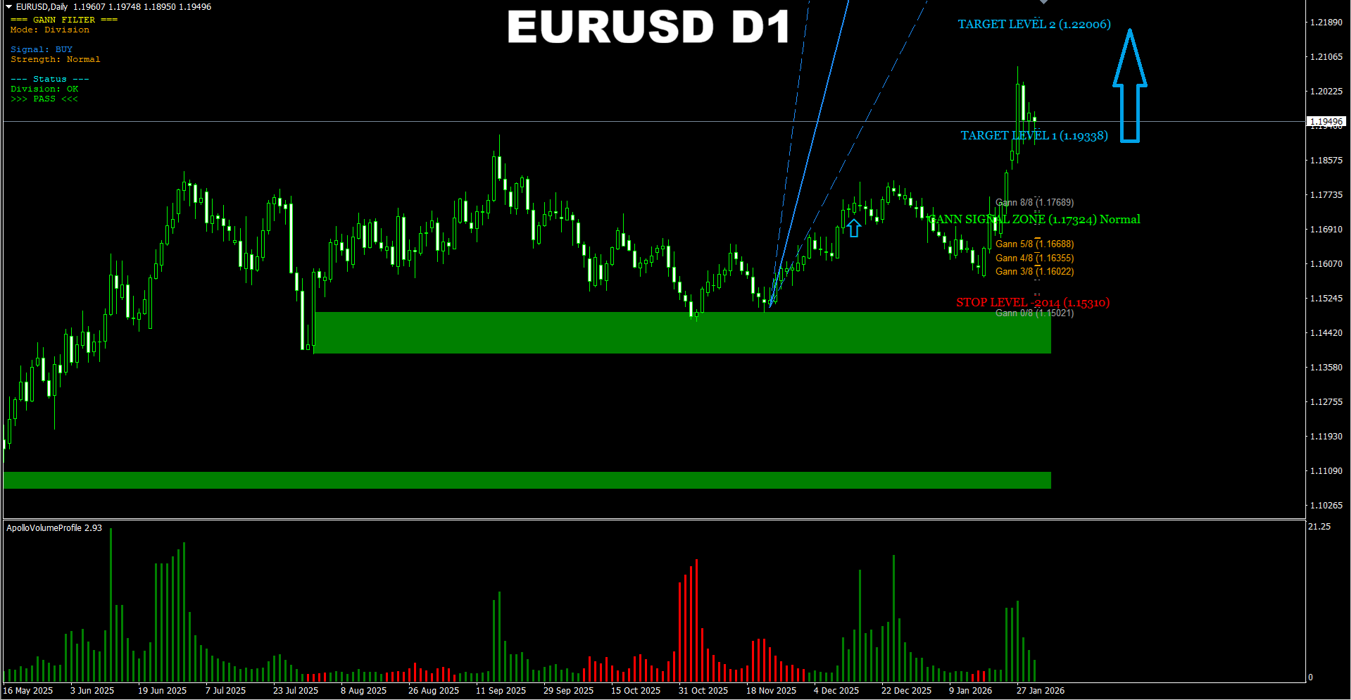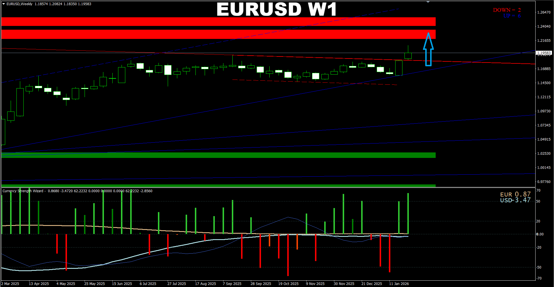Currency Strength Wizard. EURUSD Weekly chart. If we check this chart we can see that the price is now being traded above the SELL channel, actually it got to the bigger BUY zone area. The strength on this Weekly chart is also showing BUY pressure (both main strength algo + swing predictor algo). Based on what I see in the chart, I assume the price will go higher up to the Resistance area which is the price of 1.22000. And once again I do not mean it will break the SR area. But I mean that the current strength is enough for the price to push the price up to the Resistance taking into consideration we are using the Weekly chart for this analysis.