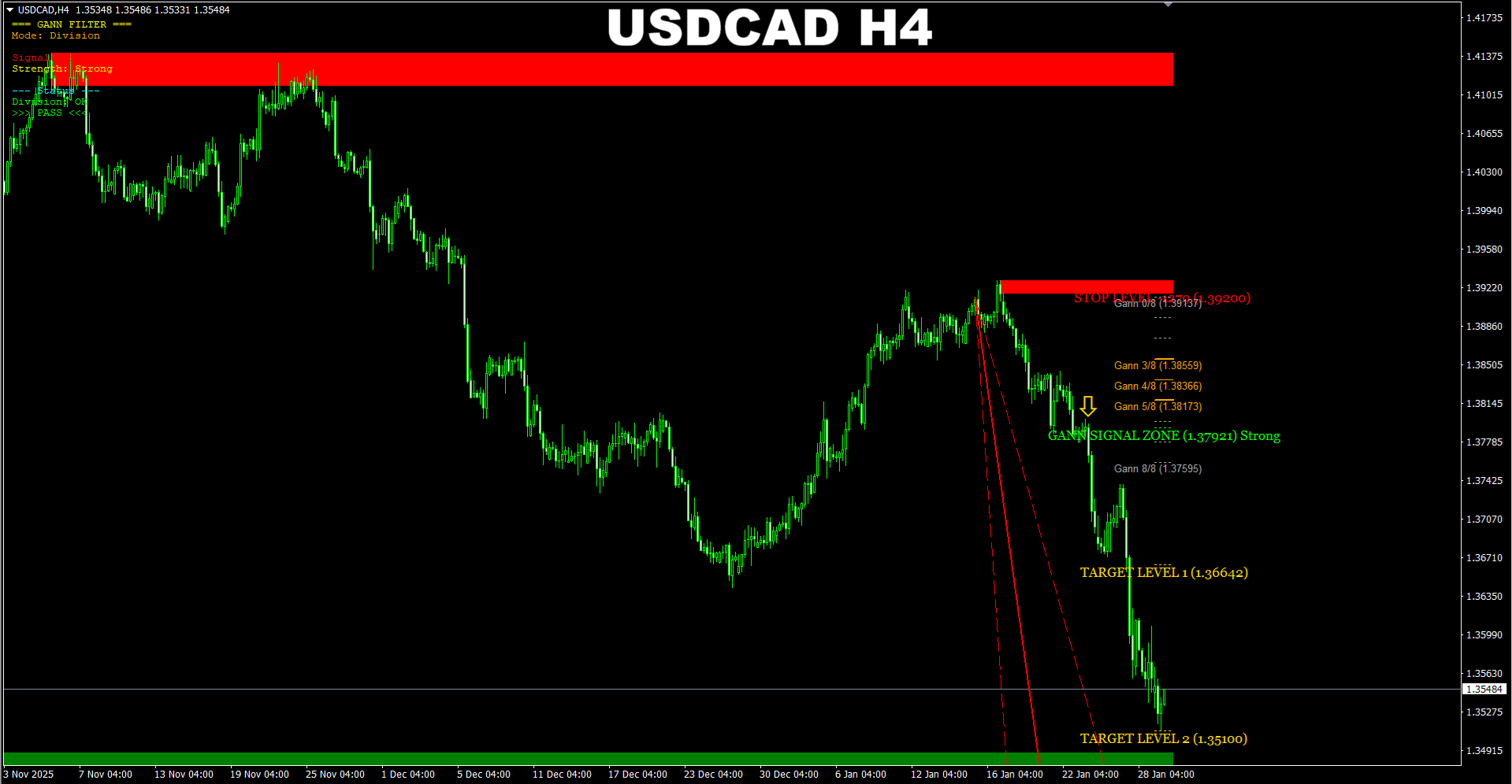 Gann Made Easy. USDCAD H4. Another update on current SELL signal. Price has reached the earlier predicted TP2 area.