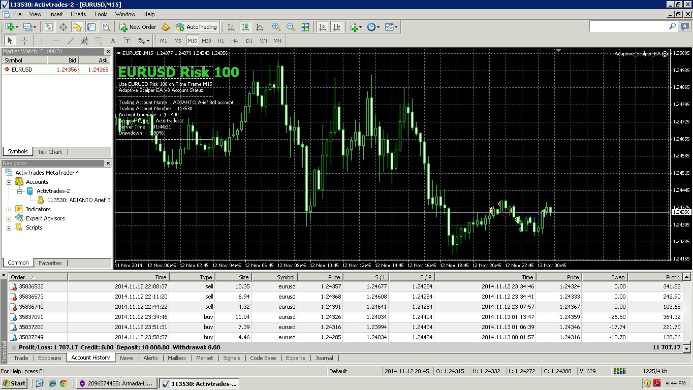 Today I tested Adaptive Scalper EA at Activtrades (real account). Using 10,000 USD with Risk 100. It seems all working fine even if the lot size is big (10 lot or more). There is no late entry or bad orders filling, this is really good.