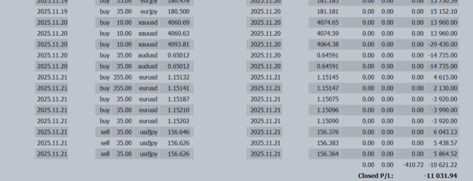 📉 -11,031 USD | A Volatile Week Caught Between Intervention Fears and Renewed Yen Selling 🧾 Weekly Trading Performance (Nov 17–21) Total P/L: -11,031 USD With no clear directional bias, the week...
