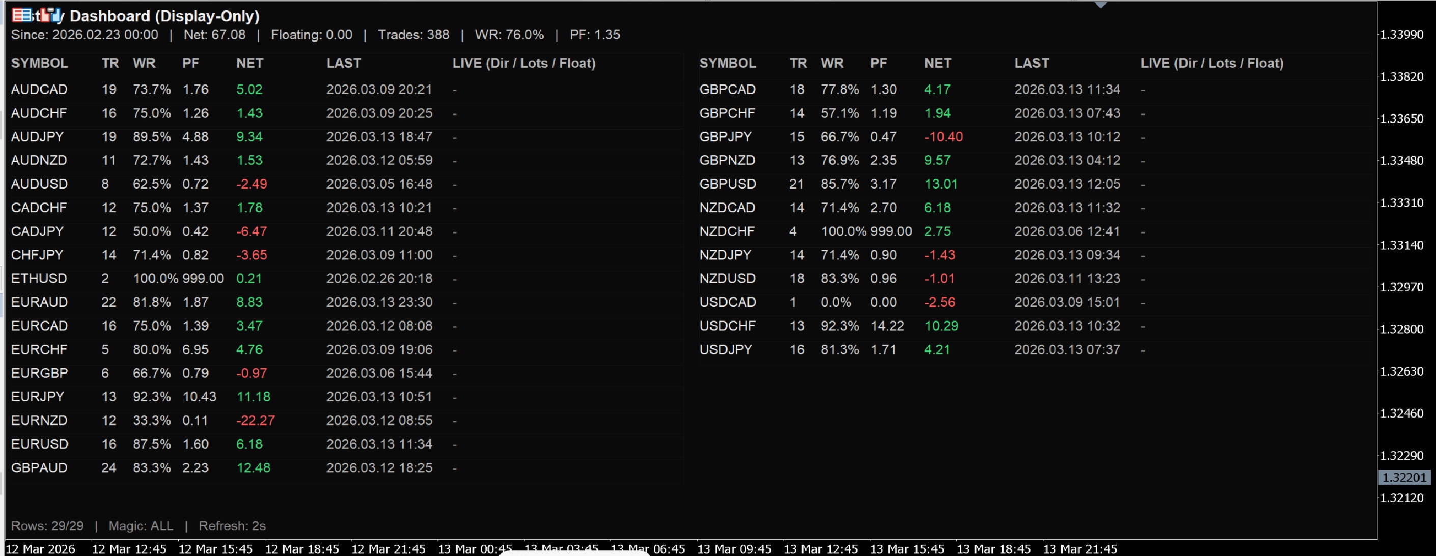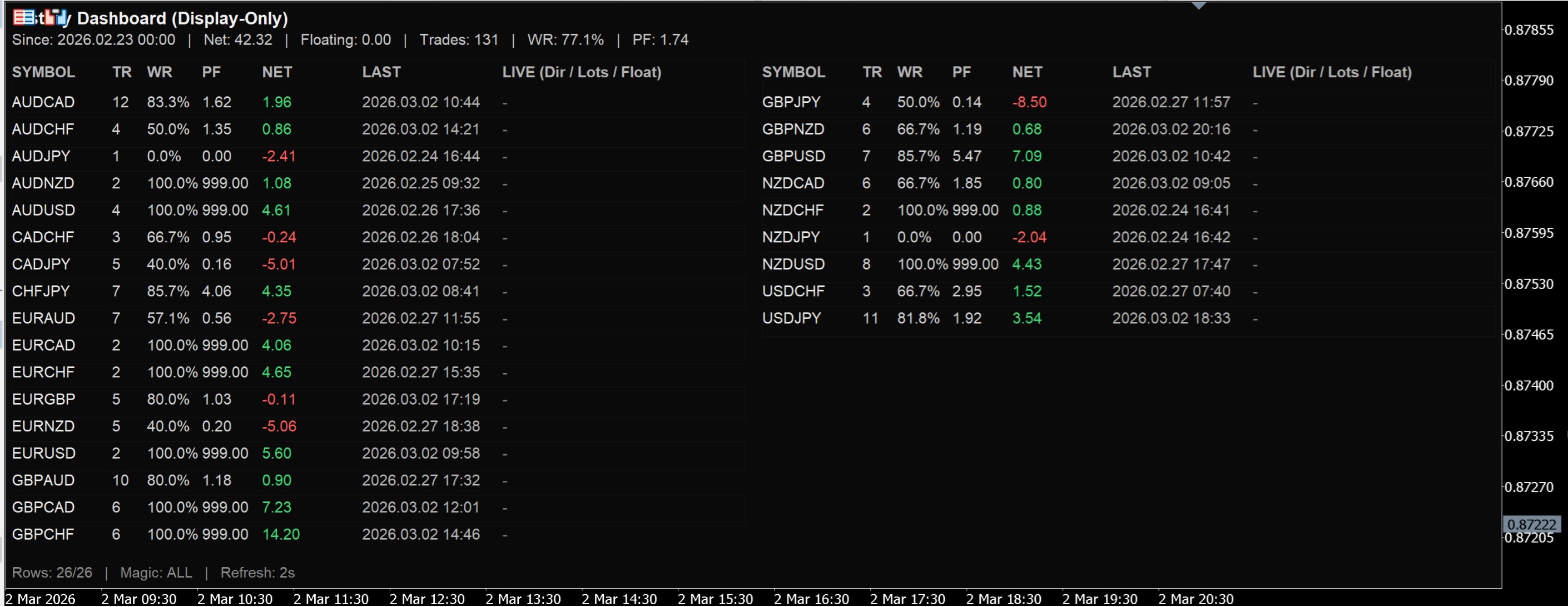 Wochenauswertung (Lernzwecke): Wochen-Snapshot 21.02–28.02: Netto +9.26; positive Treiber v.a. GBPCHF +5.85 & AUDCAD +5.14, Gegenwind GBPJPY -8.50 & EURNZD -5.06; rollierendes Fenster = zuletzt verfügbare Trades je Symbol, aktuell ist die Stichprobe pro Symbol teils noch klein → daher alle Symbole weiterhin auf minimalem Risiko. Keine Handelsaufforderung/keine Anlageberatung