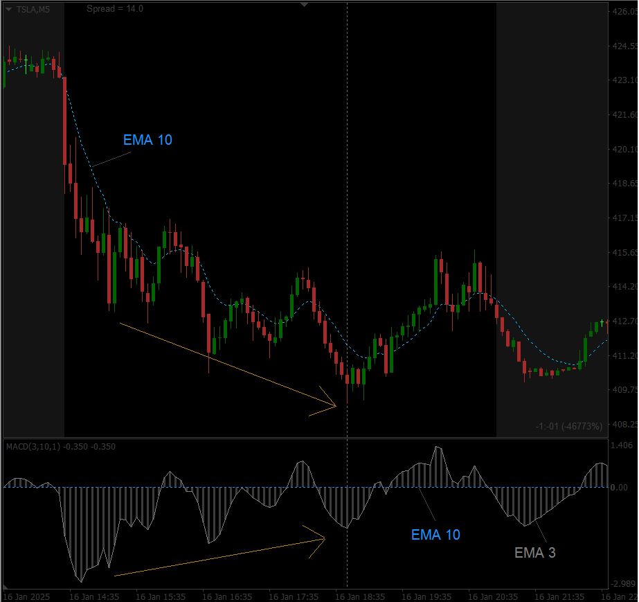 Құлап келген бағаның өсіп кеткенін немесе ренжге түскенін көріп отырмыз. Оның себебі, кейін білгеніміздей, тренд күшінің біртіндеп төмендегені, сатушылардың да ойыннан біртіндеп шығып отырғаны екен. Енді осы жағдайды дәл уақытында бақылай алу мүмкін бе еді? Ондай мүмкіндік бар екен. МАСD - баға қозғалысының гистограмма түрі. Ол жабылу бағамен жүріп отыратындықтан фитильдер ескерілмейді де шум азайып гистограмма маңызды нүктелерден түзіледі. Ал бағаның әлсіреуі мен күшеюін көрсете алуы - оның баланс сызығы (ЕМА-10) көлденең жатқандығында, көлденең сызықты сап түзеген баға нүктелерінің графикадағы шамдардан айтары басқа. Шамдар бізге баға ЕМА-10 астында, тренд жалғасуда десе де, гисторгамма баға ЕМА-10 астында, бірақ алдыңғыдай қарқын жоқ дегенді меңзеп отыр. Шамдар мен гистограммадағы информация бір болғанмен, бағадағы әлсіреу мен күшеюді көлденең сызық балансында аңғару оңай. MACD - көпқырлы қызық инструмент.