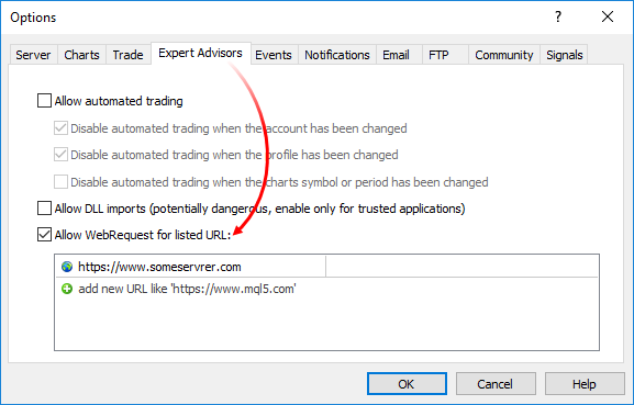 최종 사용자 보안을 위해 허용된 IP 주소 목록이 클라이언트 터미널 측에 구현됩니다. 목록에는 소켓* 및 WebRequest 기능을 통해 MQL5 프로그램이 연결할 수 있는 IP 주소가 포함되어 있습니다. 예를 들어, 프로그램이 https://www.someserver.com에 연결해야 하는 경우, 이 주소는 목록에 있는 터미널 사용자가 명시적으로 표시해야 합니다. 주소를 프로그래밍 방식으로 추가할 수 없습니다.