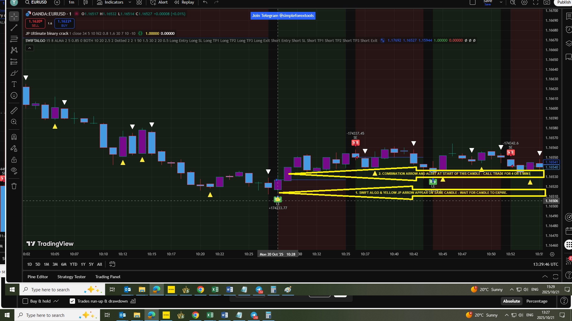 - Sniper arrow appears ON THE SAME CANDLE where Swift Algo arrow appeared. VERY IMPORTANT HERE:WE SHOULD WAIT FOR THAT CANDLE TO EXPIRE TO CONFIRM THAT BOTH APPEARED IN THE SAME CANDLE AND THEY ARE INTACT - A COMBINATION ARROW AND ALERT WHICH SHOULD TRIGGER A TRADE SHOULD APPEAR ON THE NEXT CANDLE (CONFLUENCE OF THE SWIFT ALGO ARROW AND THE Sniper arrow IN THE SAME CANDLE).