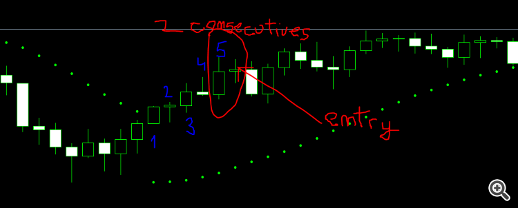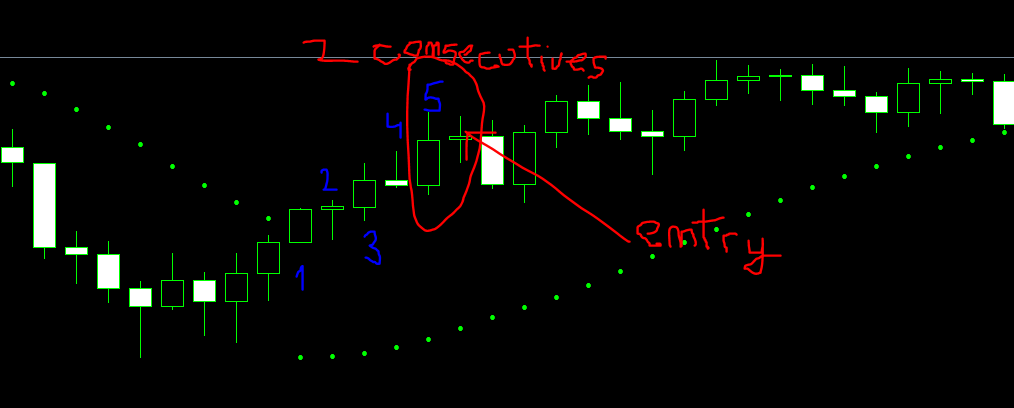 If the counting is ending with the consecutive candles, then entry as well, like in the bellow case.