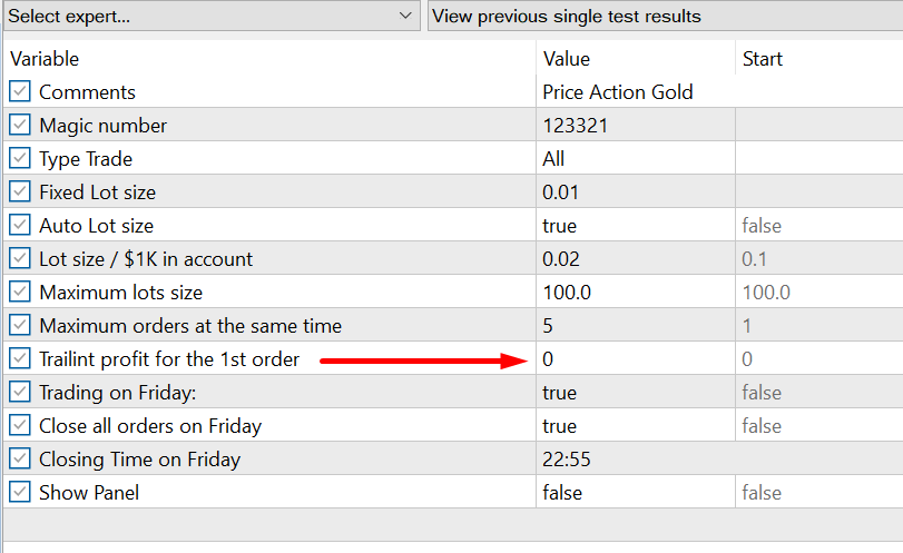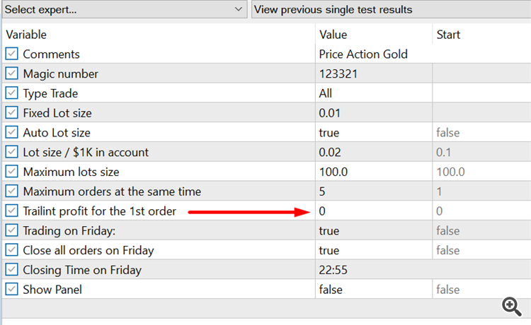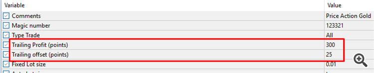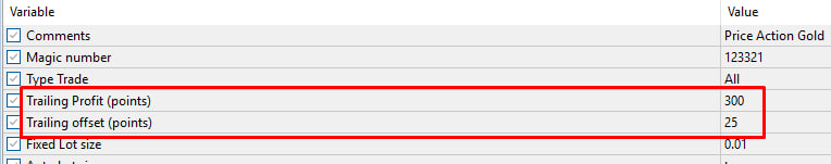 For traders who going to use Trailing profit of Price Action Gold, I recommend setting the Trailing Profit=300 and Trailing offset=25 (or you can optimize parameter yourself)