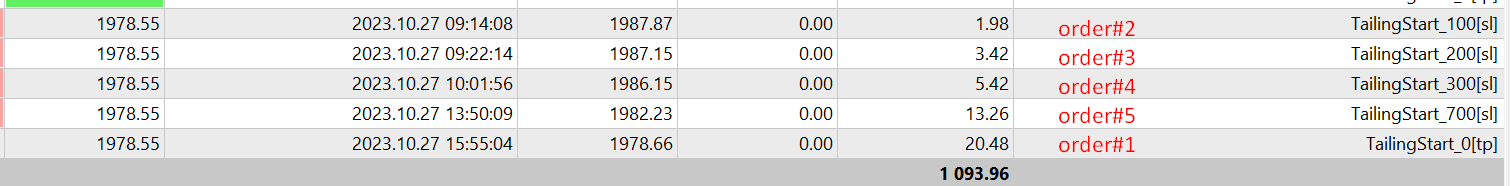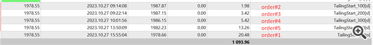 Each order will have the same entry point, but each of them will be closed according to an individual Trailing Profit, as you can see from the example of closing 5 orders on Friday: