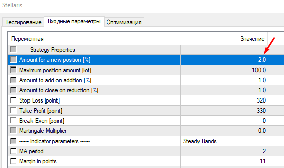 The lot size is set here as a percentage. By default, it is set to 2%. Change it depending on how much risk you want to take. But don't overstate it too much. More than 5% is not recommended.