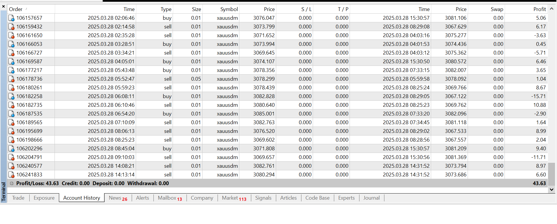 Dilipbhai Mavjibhai Makwana 2025.03.22 07:36 #2 profit of the week.... from date: 17/03/2025 to 21/03/2025 0.01 lot size only. max DD is only 45$ 75$ profit... 100$ withdrawal.... check our live signal in the product description