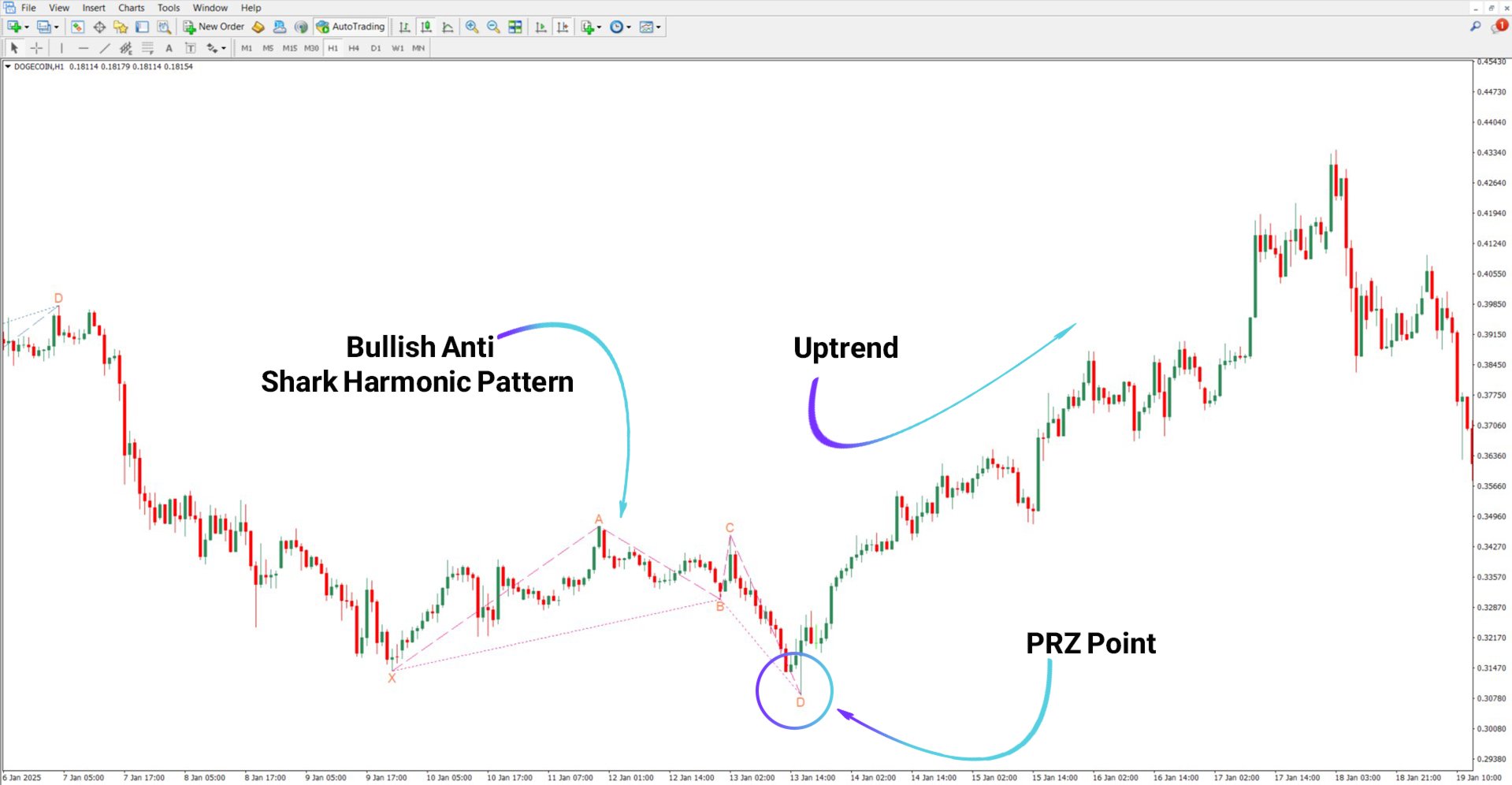 According to the Dogecoin (DOGE) one-hour chart, the Anti Shark harmonic pattern completes at point "D." As shown in the illustration, point "D" serves as the PRZ, a potential reversal zone; from this area, an upward trend initiates.