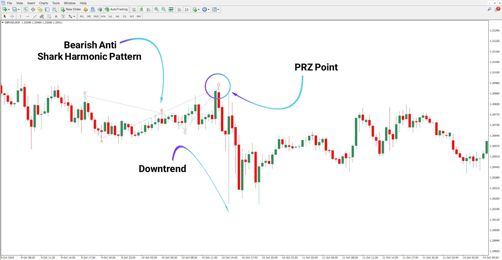 According to the GBP/USD 30-minute chart analysis, after the bearish Anti Shark pattern is completed at point "D," the price reverses direction. Point "D" is a suitable zone for initiating sell setups in such cases.