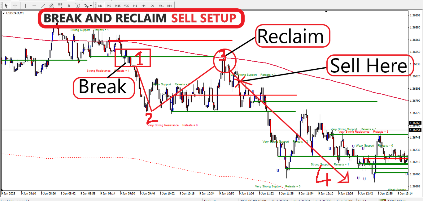 Sell Setup: Red resistance (1+ retests) forms → price fails to go higher → breaks green support → 🔽 Sell on breakdown.