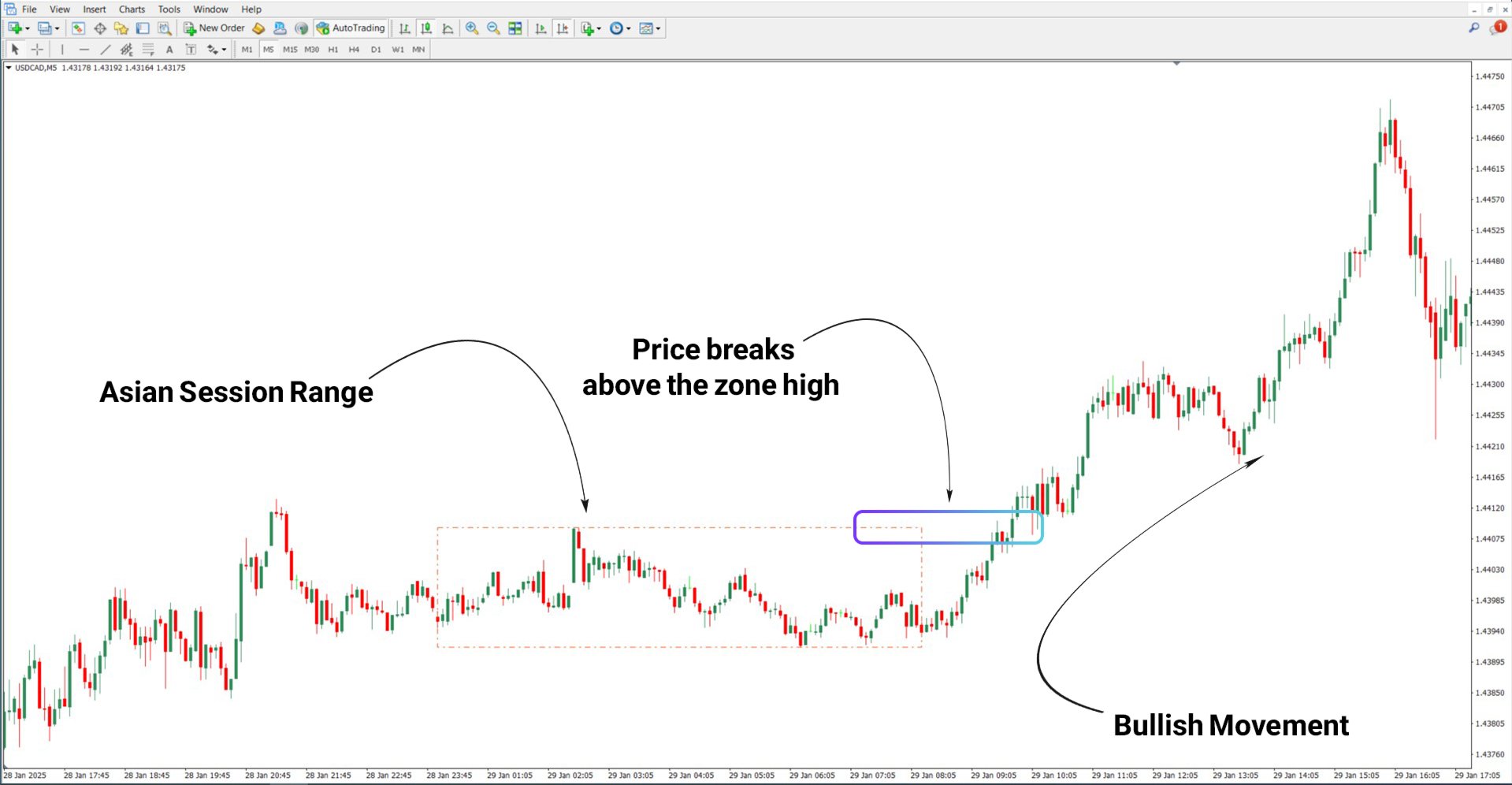 In the 5-minute chart of USD/CAD, the Asian session range is indicated with a yellow box. The price breaks above the upper boundary of the range, suggesting a bullish trend setup.