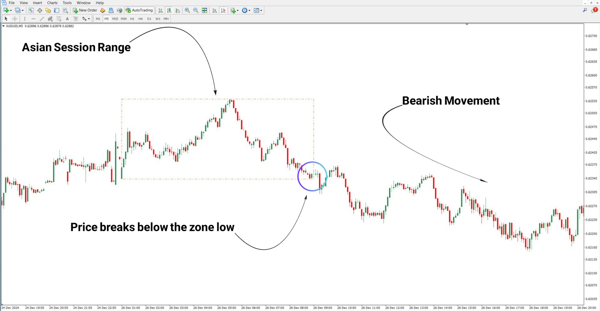 On the 5-minute chart of AUD/USD, price action breaks below the Asian session range during the Tokyo session. Given the behavior of the market during the London and New York sessions, this breakdown can be seen as a potential entry point for short trades.