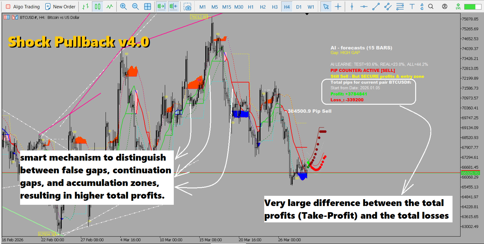 Shock Pullback 인디케이터는 되돌림 및 매집 구역을 감지하는 데 있어 진정한 혁신입니다. 완전히 새로운 알고리즘을 기반으로 구축되어 트레이더가 거래 기회를 식별하고, 가격 움직임을 추적하며, 되돌림, 매집 구역, 갭 및 돌파를 쉽고 명확하게 감지할 수 있도록 합니다.