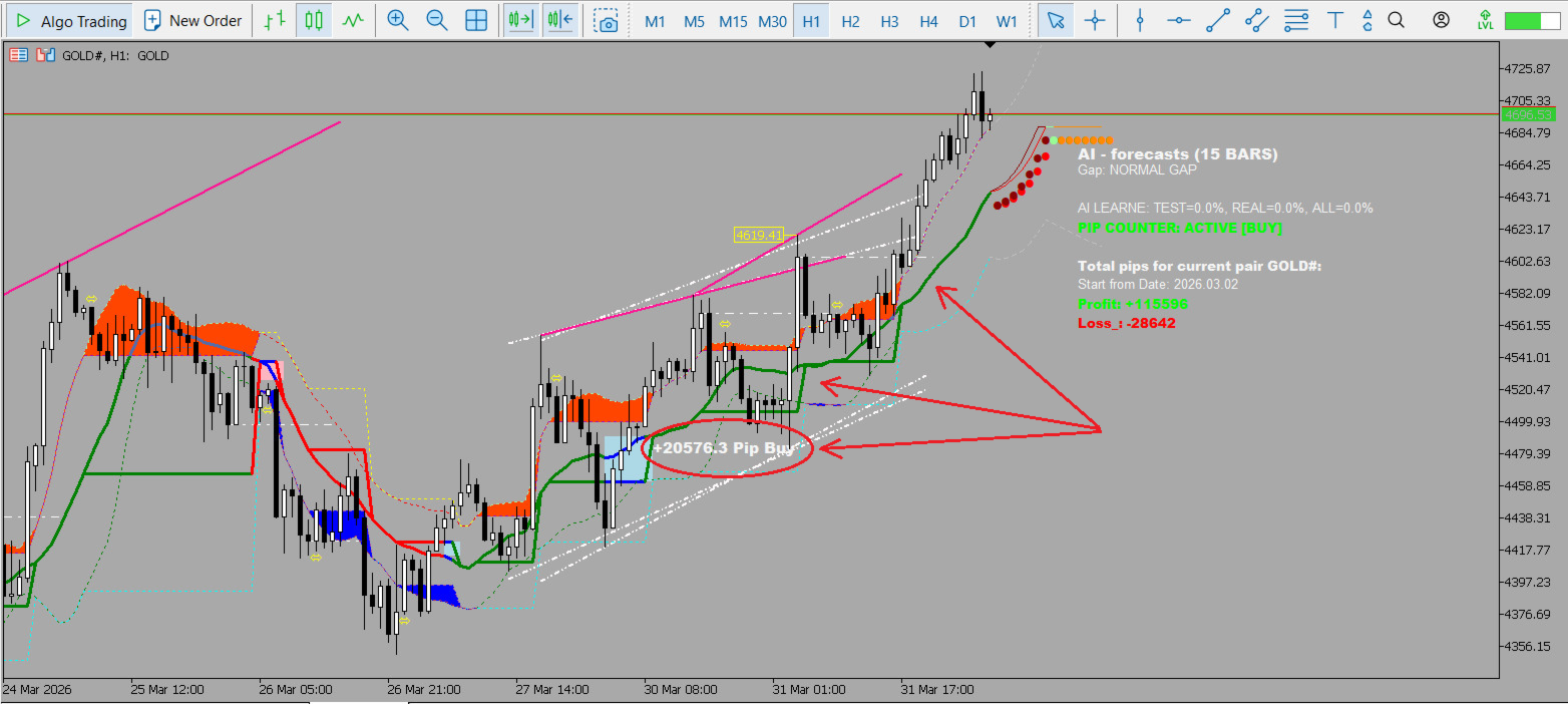 4_ 활성 거래의 수익 핍(흰색 표시) 및 이전 수익 핍(녹색) 또는 손실 핍(빨간색) 표시. 모든 핍 숫자는 제어판에서 숨길 수 있음.