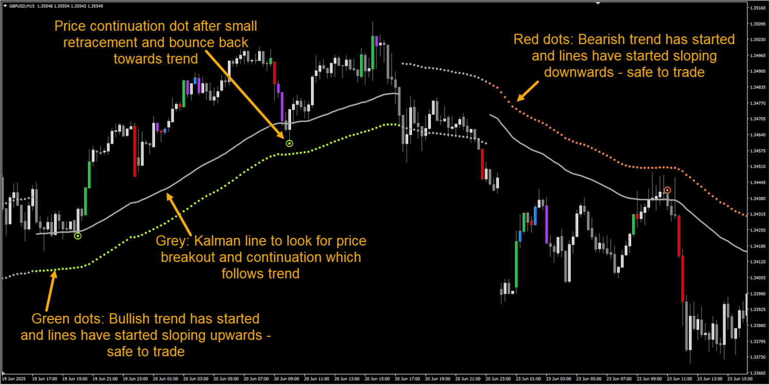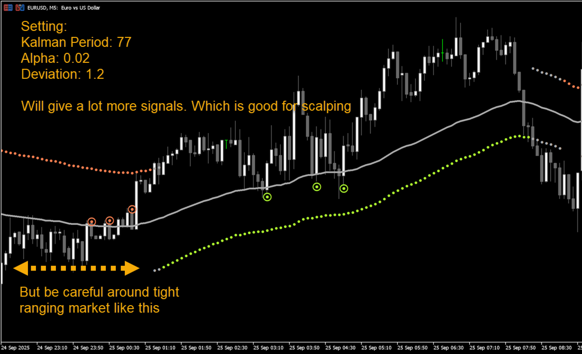 - Scalping: M1–M15 (faster Kalman, shorter ATR).