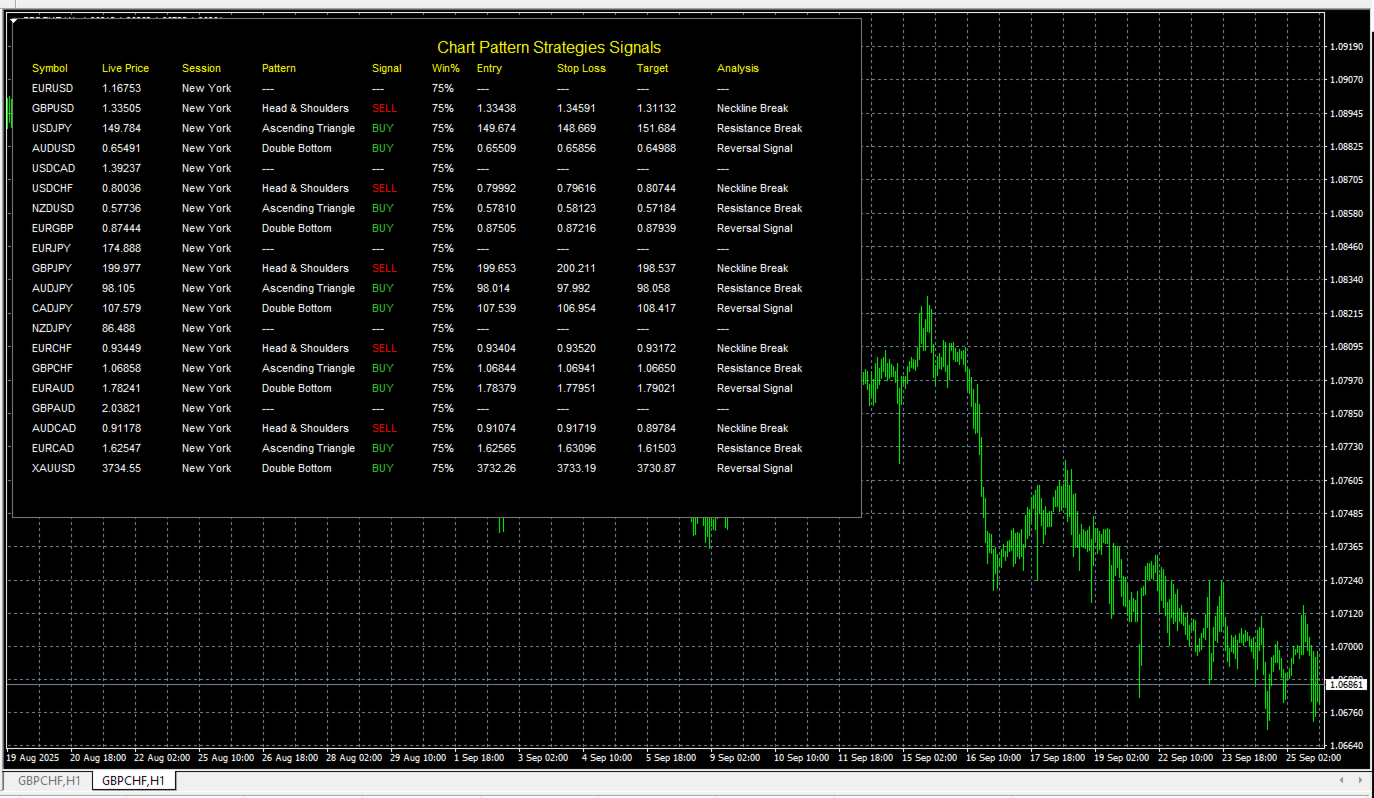 Important Note: The pattern detection logic in this version is simulated to provide a functional framework and showcase the indicator's capabilities. For live trading, the AnalyzePatternsForSymbol function would need to be programmed with robust algorithms for each of the 10 chart patterns.