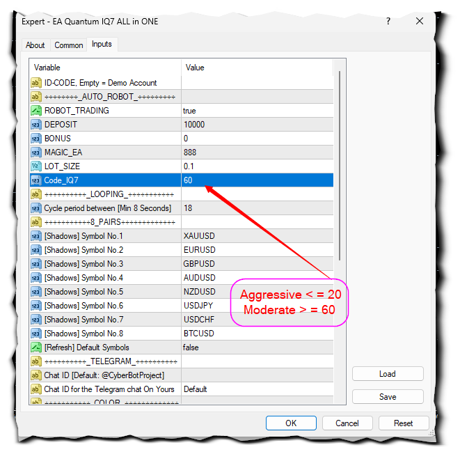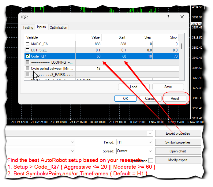 Find the best AutoRobot setup from your research: 1. Setup > Code_IQ7 { Aggressive <= 20 || Moderate >= 60 } 2. Best Symbols/Pairs and/or Timeframes { Default = H1 }