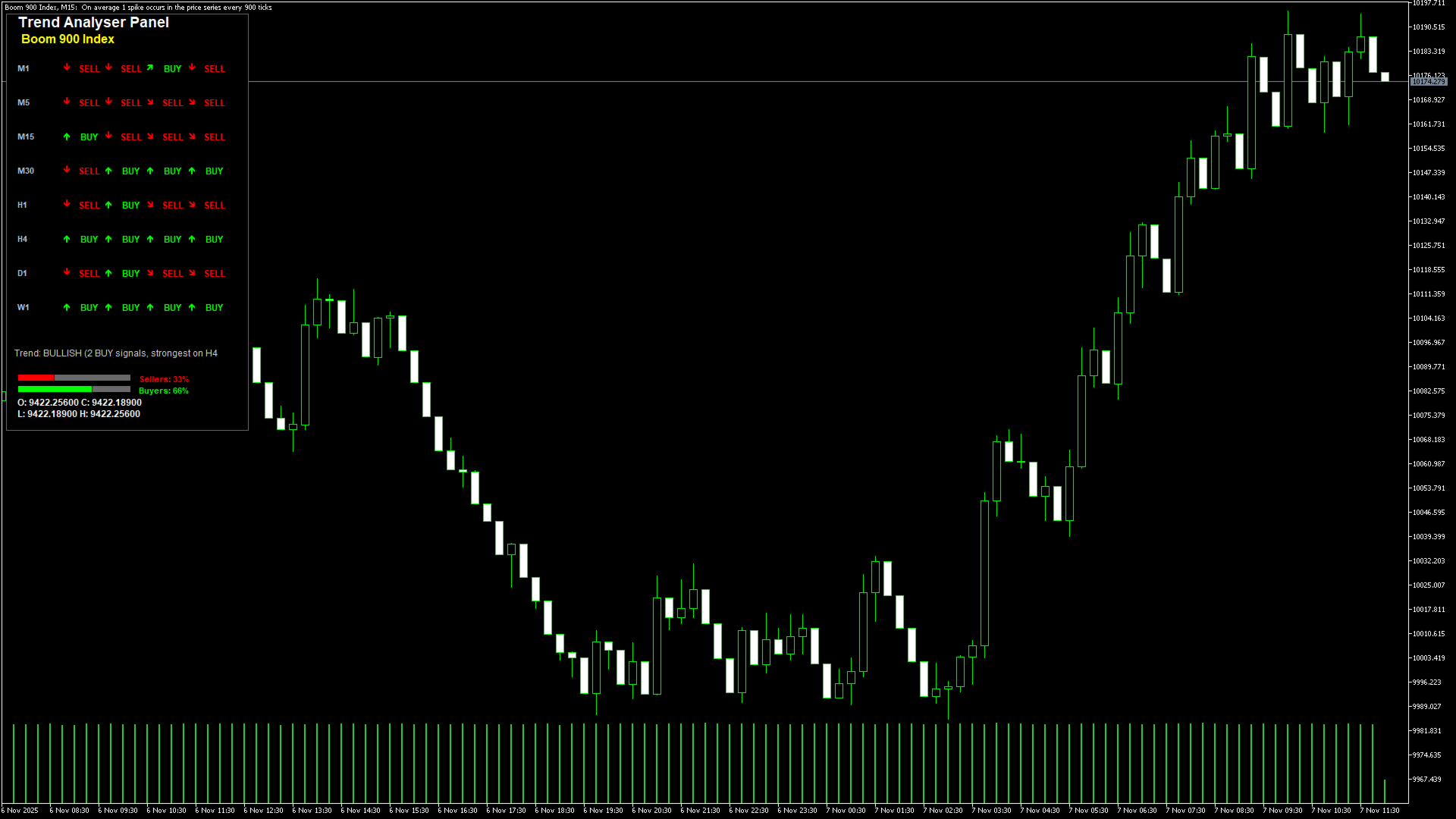 The overall trend summary, buyer/seller power bars, and current price information are calculated and displayed at the bottom.