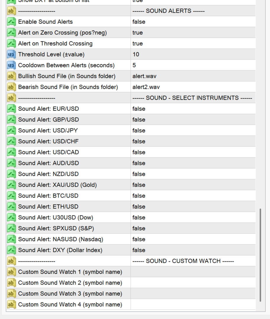 | DXY At Bottom | Show DXY at bottom of list (vs top) | True |