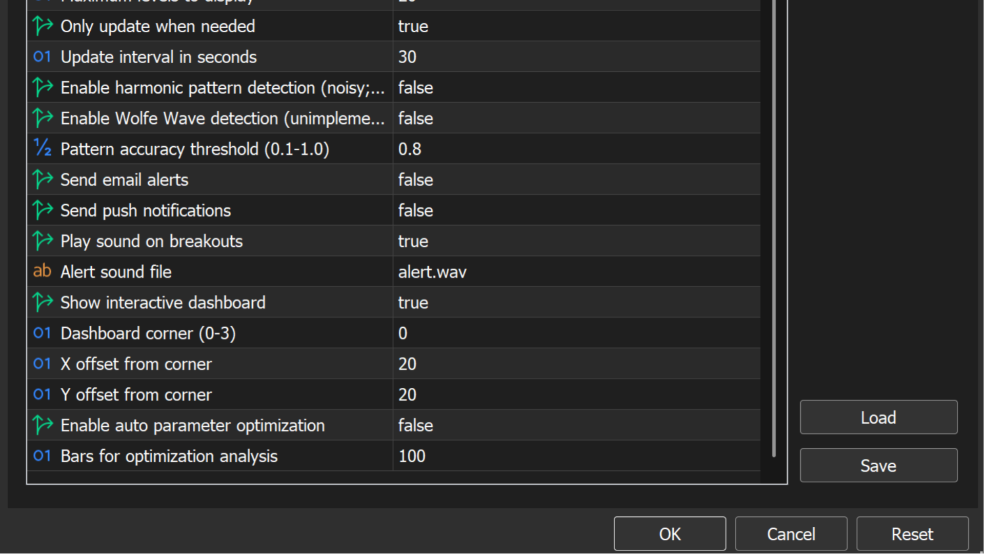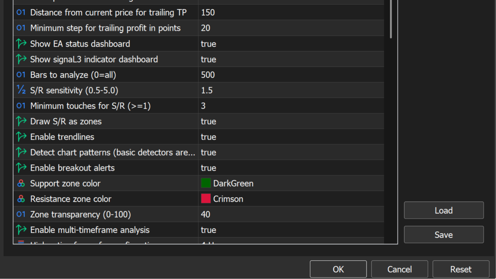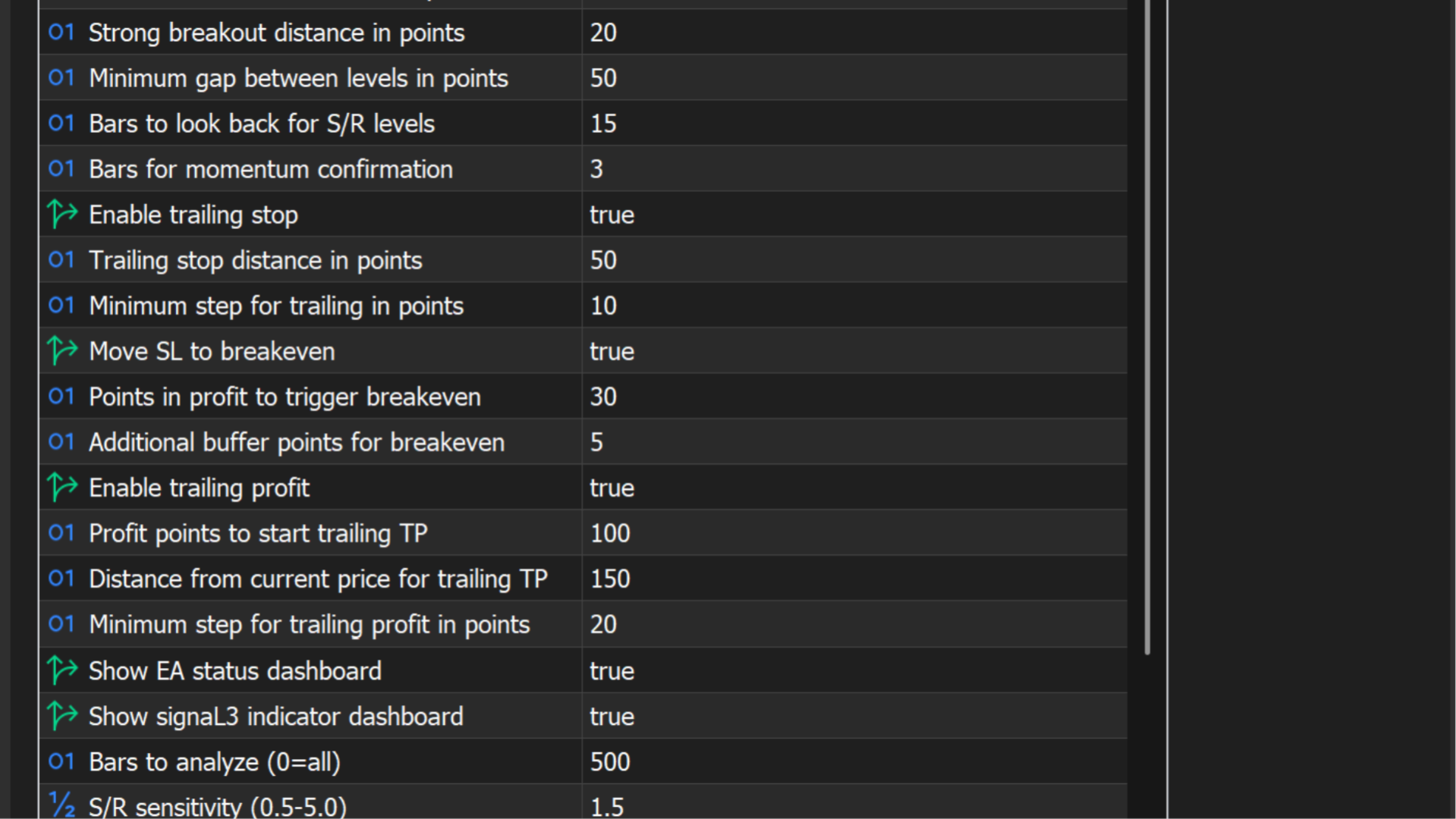 가격이 설정된 포인트 거리만큼 레벨을 넘어 마감하고, 두 가지 확인 조건 중 하나 이상을 만족할 때만 돌파로 인식합니다: 돌파 방향으로의 3연속 종가, 또는 별도의 더 엄격한 임계값을 초과하는 강한 임펄스 움직임. 동일 레벨은 최소 가격 간격 또는 최소 시간 간격이 경과하기 전까지는 다시 거래되지 않으므로, 이미 소진된 움직임에서의 반복 진입을 방지합니다.