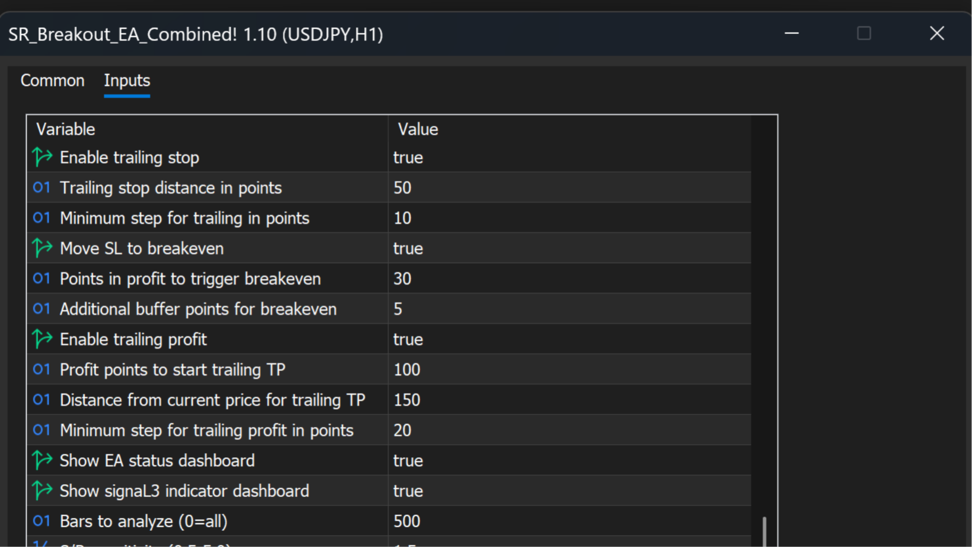 손절과 익절은 ATR 기반이며 SL과 TP에 대해 독립적인 배수를 사용하므로, 손익비가 고정 포인트 거리가 아니라 현재 변동성에 적응합니다. 포지션이 열린 후에는 다음 세 가지 관리 모듈을 독립적으로 활성화하거나 비활성화할 수 있습니다.
